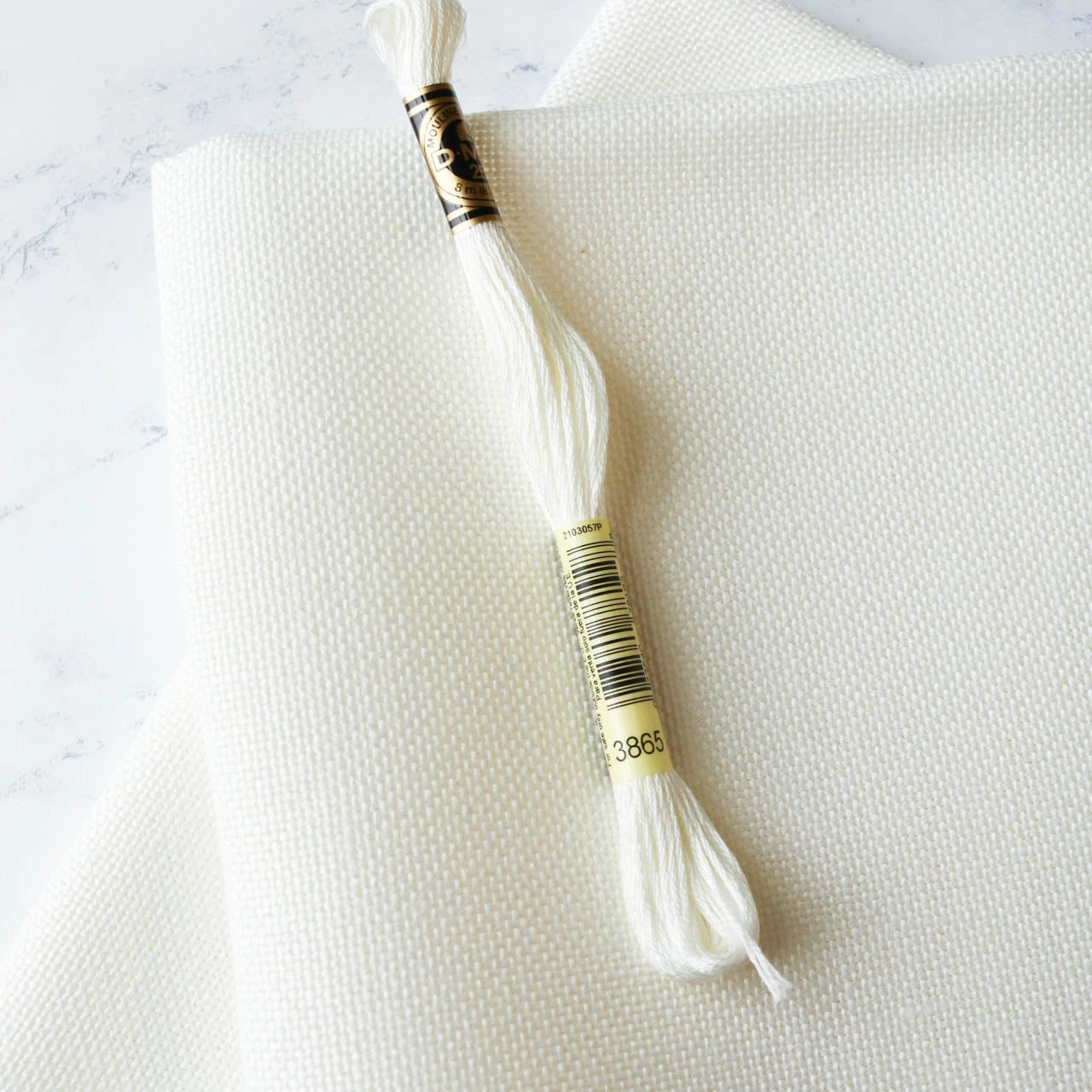 Cork is an evenly woven 100% linen fabric that can be used for cross stitch and other forms of counted thread embroidery. This White color most closely matches DMC embroidery floss color #3865.