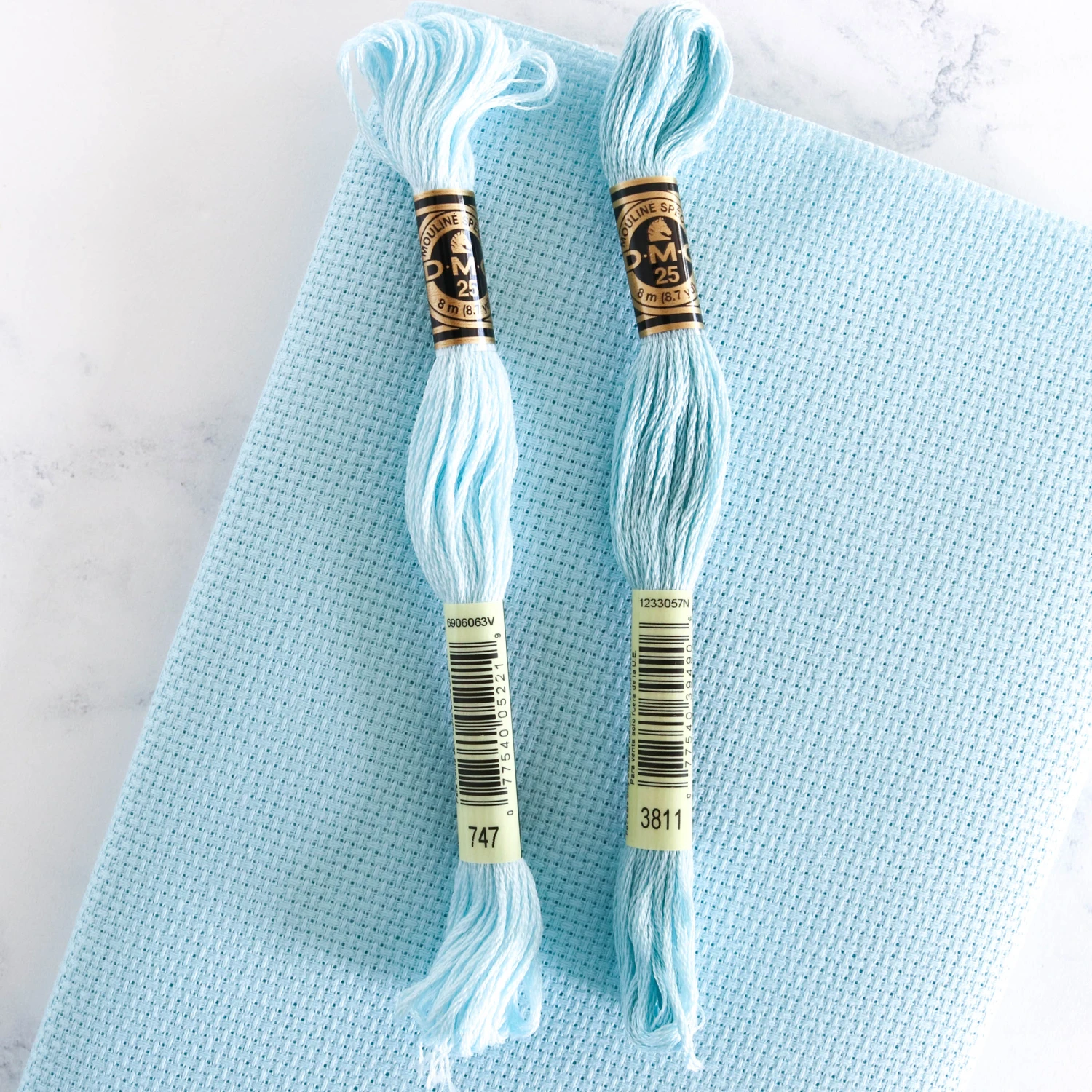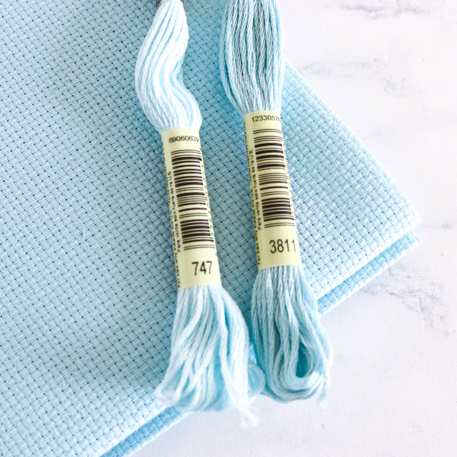 Please note that the color may vary depending on your screen. This light aqua blue fabric is most similar to DMC embroidery floss colors #747 and #3811.