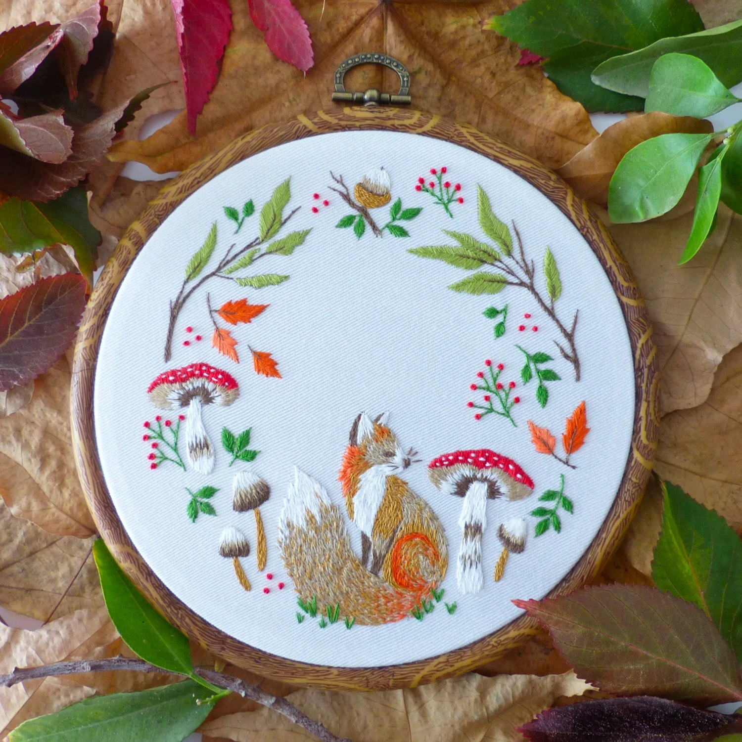 Each embroidery pattern uses several types of stitches. The designs are screen printed onto the fabric, so you can start stitching right away. A guide showing suggested stitches and colors is included.