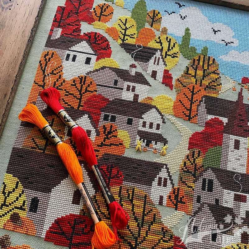 A quaint town is nestled among hills and autumn trees in this cross stitch pattern by Autumn Lane Stitchery.