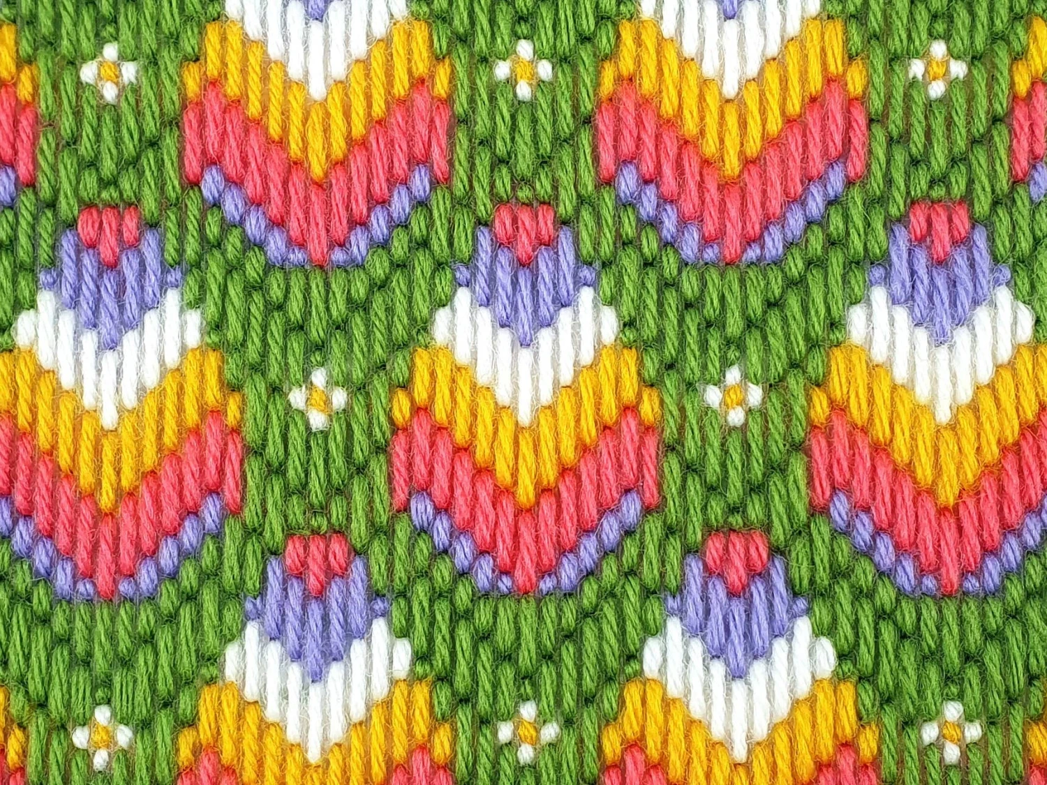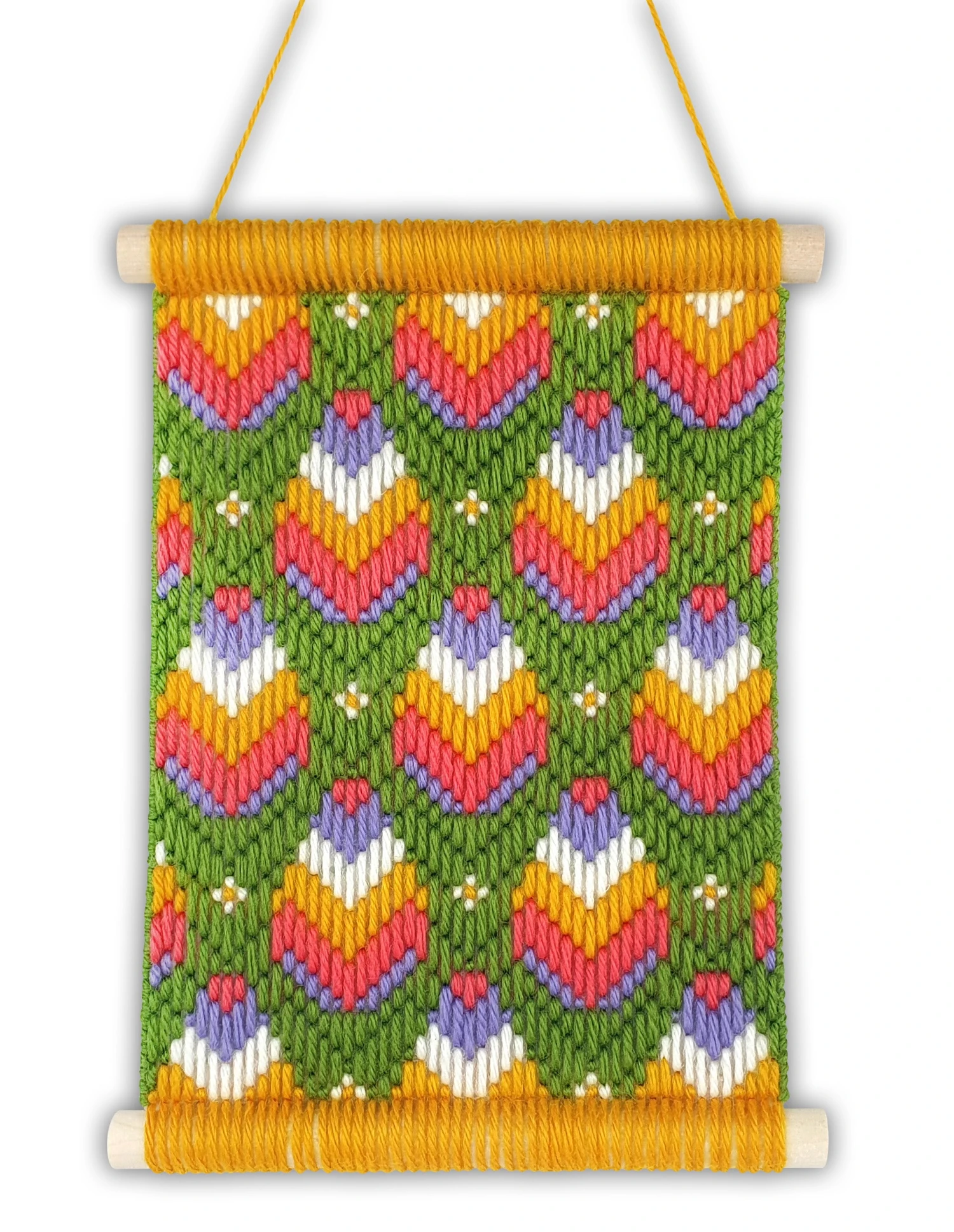 The Easter Egg Bargello Kit includes everything needed to make this beautiful geometric wall hanging.