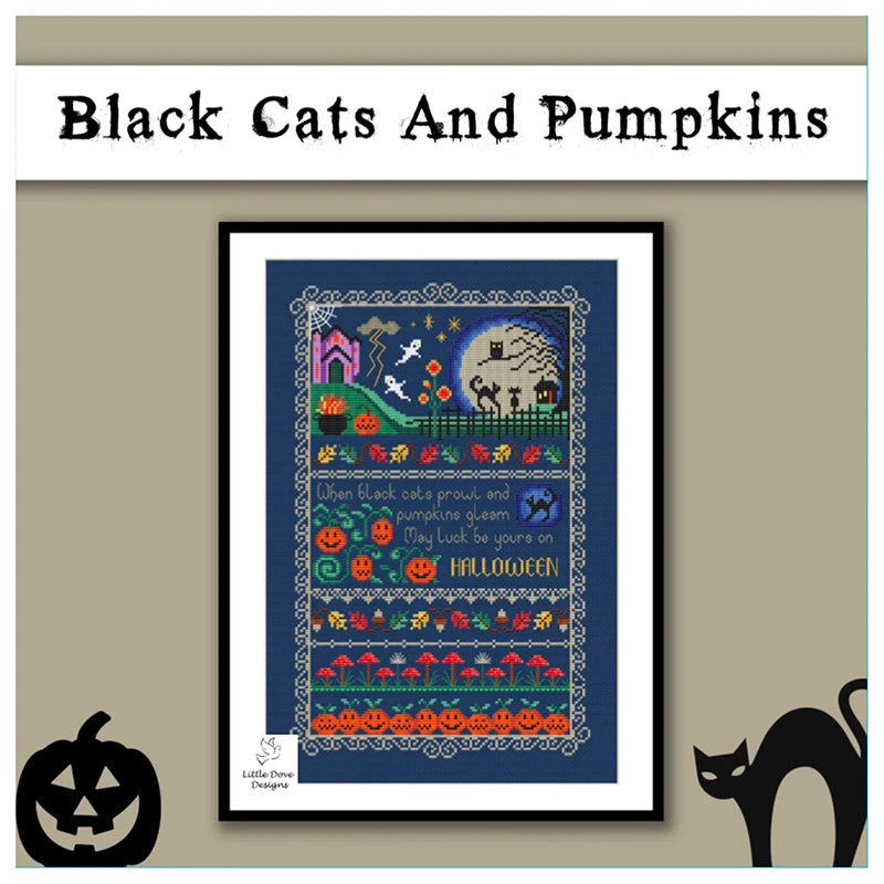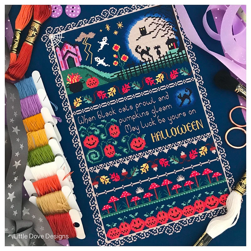 This fun cross stitch pattern by UK-based Little Dove Designs is full of Halloween motifs you will love to stitch. With a bright color palette that pops on navy blue fabric, the design features the quote “When black cats prowl, and pumpkins gleam, my luck be yours on Halloween!”