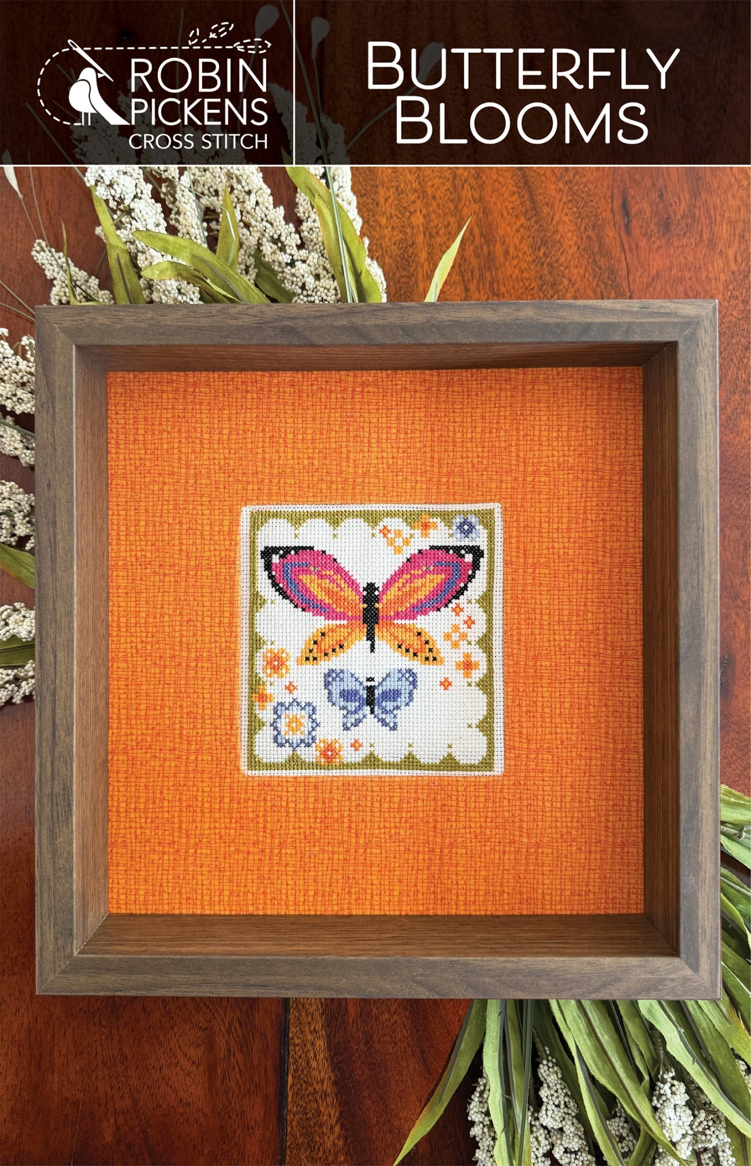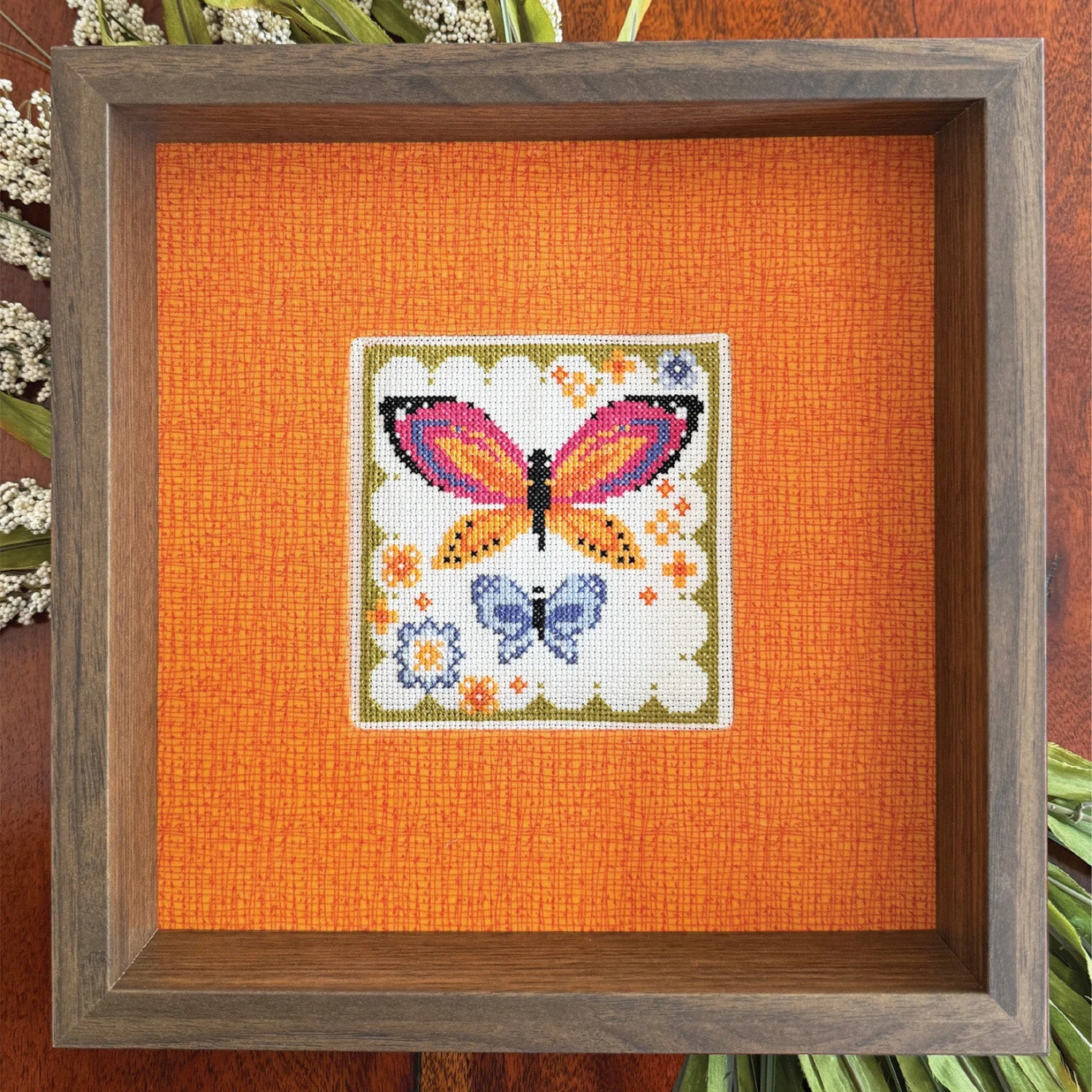 This cheery little counted cross stitch design by Robin Pickens celebrates our fluttery friends. A large and small butterfly are visiting little blooms within a scalloped border. This makes an approximately sized 5″ x 5″ design that looks great in a small pillow or framed.Â