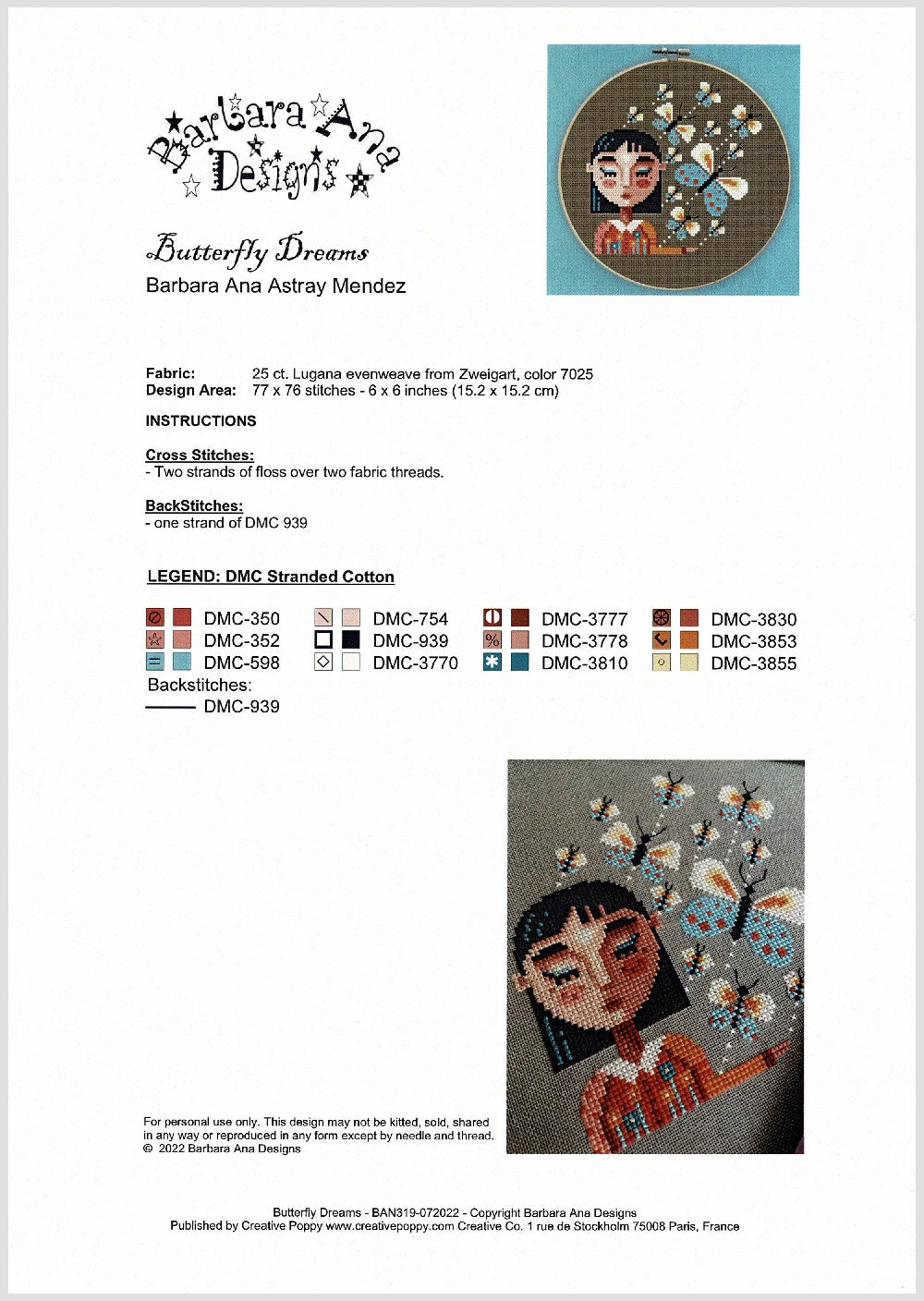 - Model was stitched on 25-count Lugana evenweave from Zweigart using threads by DMC