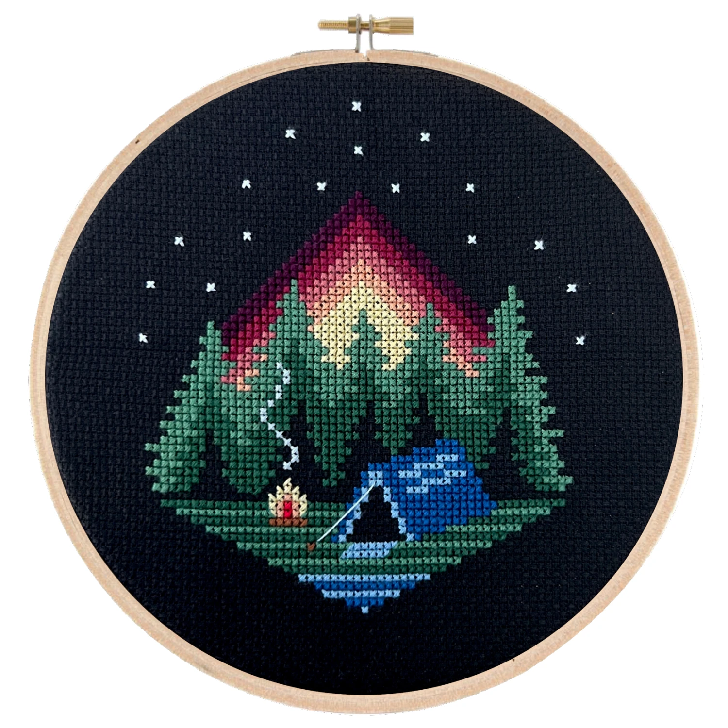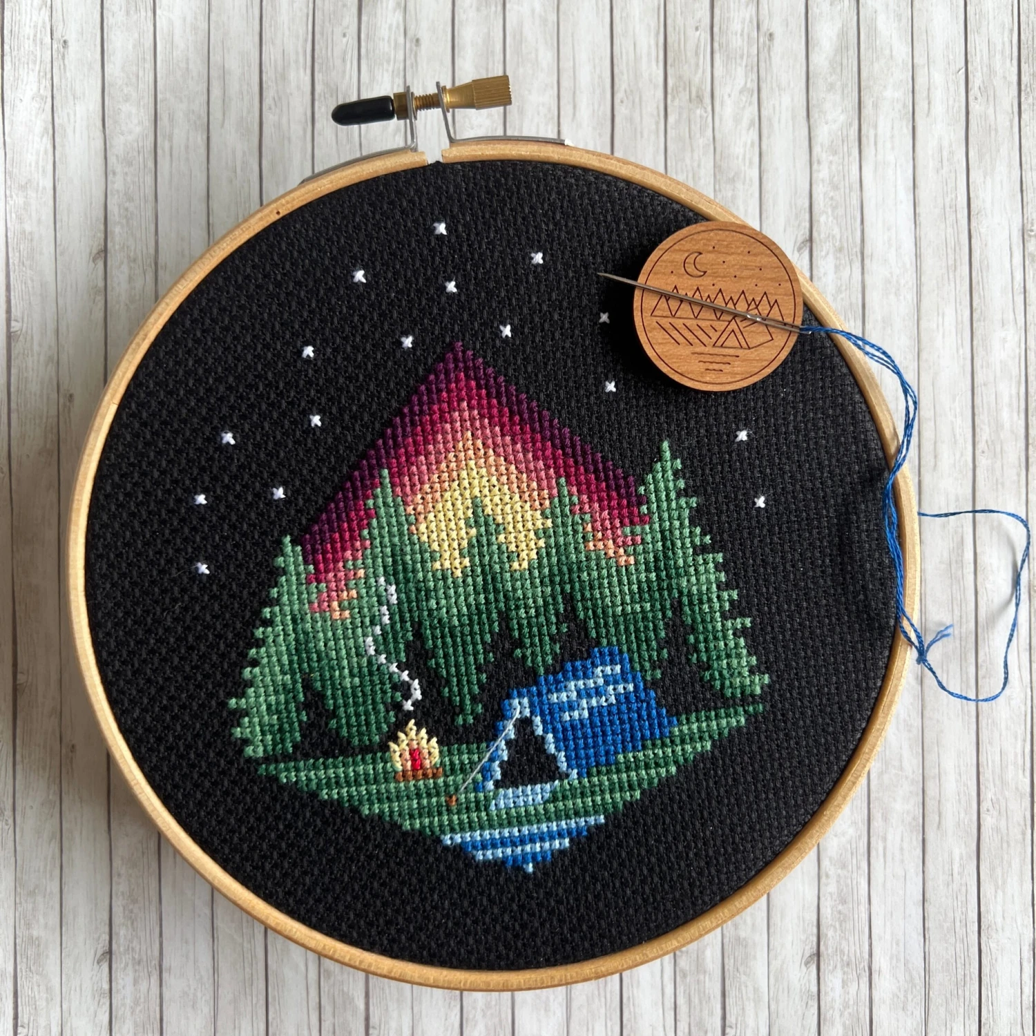 Capture the peaceful magic of a night in the woods with this cross stitch pattern by Pigeon Coop that features a glowing sunset, pine trees, and a cozy campsite. A perfect stitch for anyone who loves the great outdoors.Â