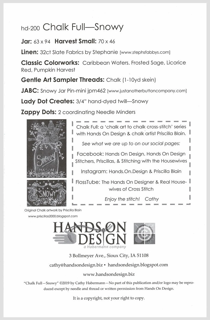 The chart calls for a mix of thread from Classic Colorworks and The Gentle Arts, but DMC conversions for all are provided. The model was stitched on hand-dyed 32-count slate fabric. Chalkboard black Aida or linen would make a fine substitution.