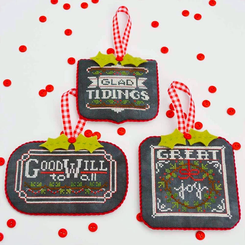 These chalkboard-inspired cross stitch ornaments are the perfect addition to your holiday decor. They work up quick, and would make great holiday gifts. This collection by Hands on Design includes charts for all three ornaments. Wool felt leaves and little red buttons are included for finishing the ornaments.