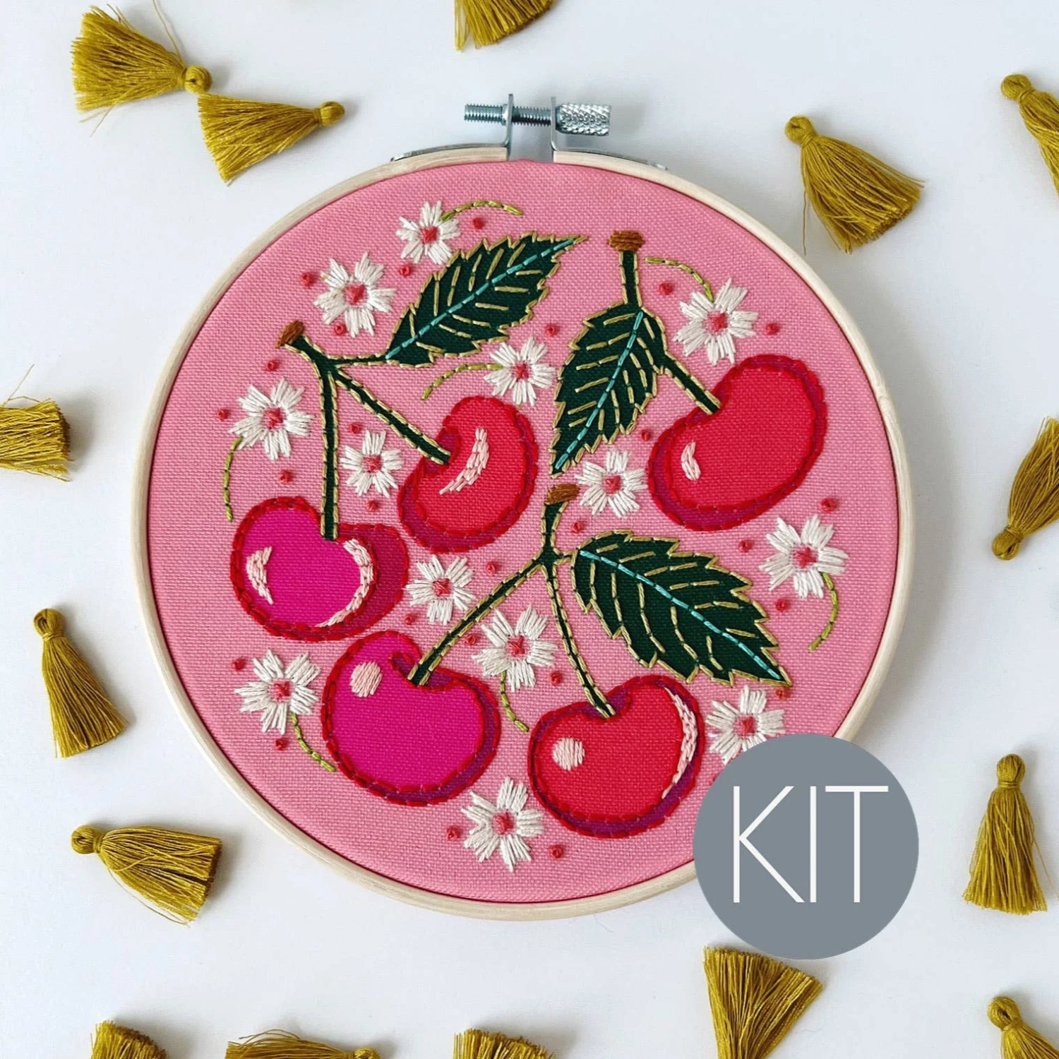 Spring cherry blossoms and freshly picked cherries shine on a pink background in this beautiful hand embroidery kit by indie designer Rikrack. The design comes pre-printed on the fabric so it is ready to pop in your hoop and go. The kit has everything you need!