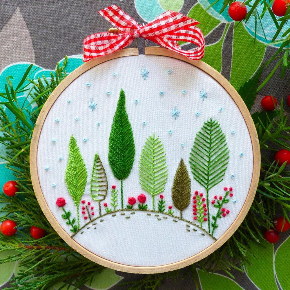 Each embroidery pattern uses several types of stitches. The designs are screen printed onto the fabric, so you can start stitching right away. A guide showing suggested stitches and colors is included.