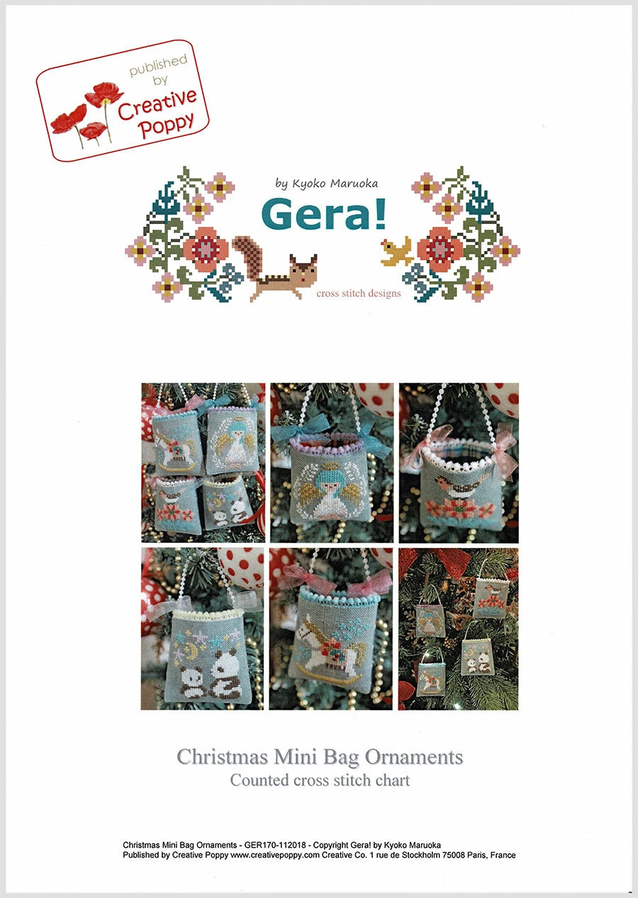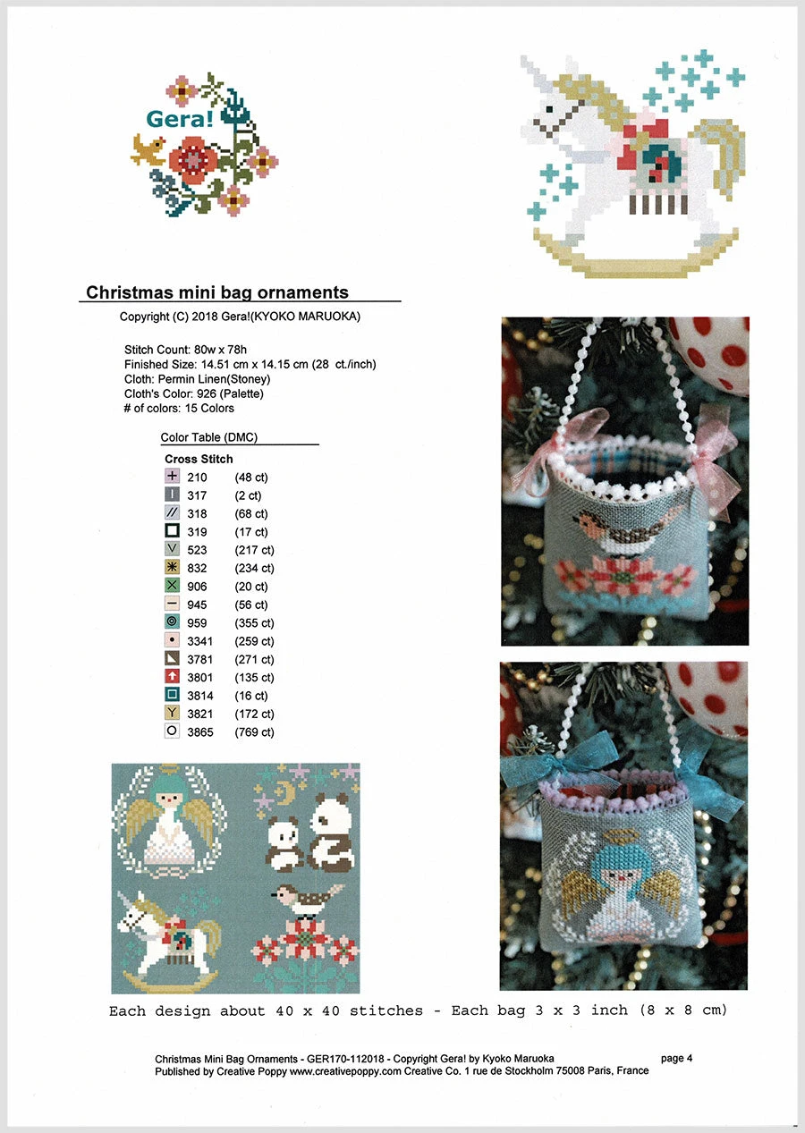 With this cross stitch pattern by Japanese designer Kyoko Maruoka (Gera!), you can stitch up four adorable Christmas ornaments. Finish them as little bags as shown to hold gift cards or small trinkets. Alternatively, you can finish them off in hoops or small frames.