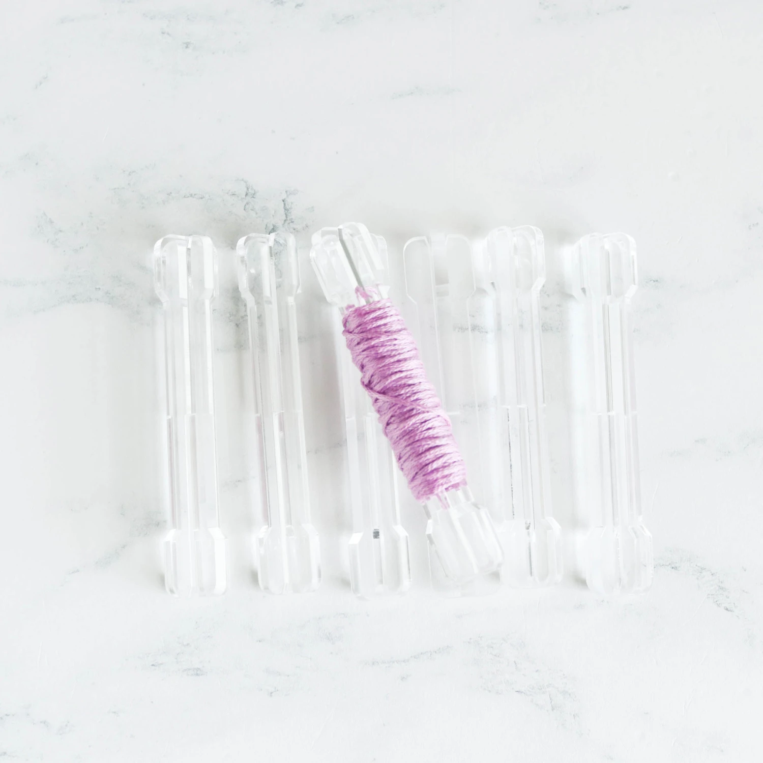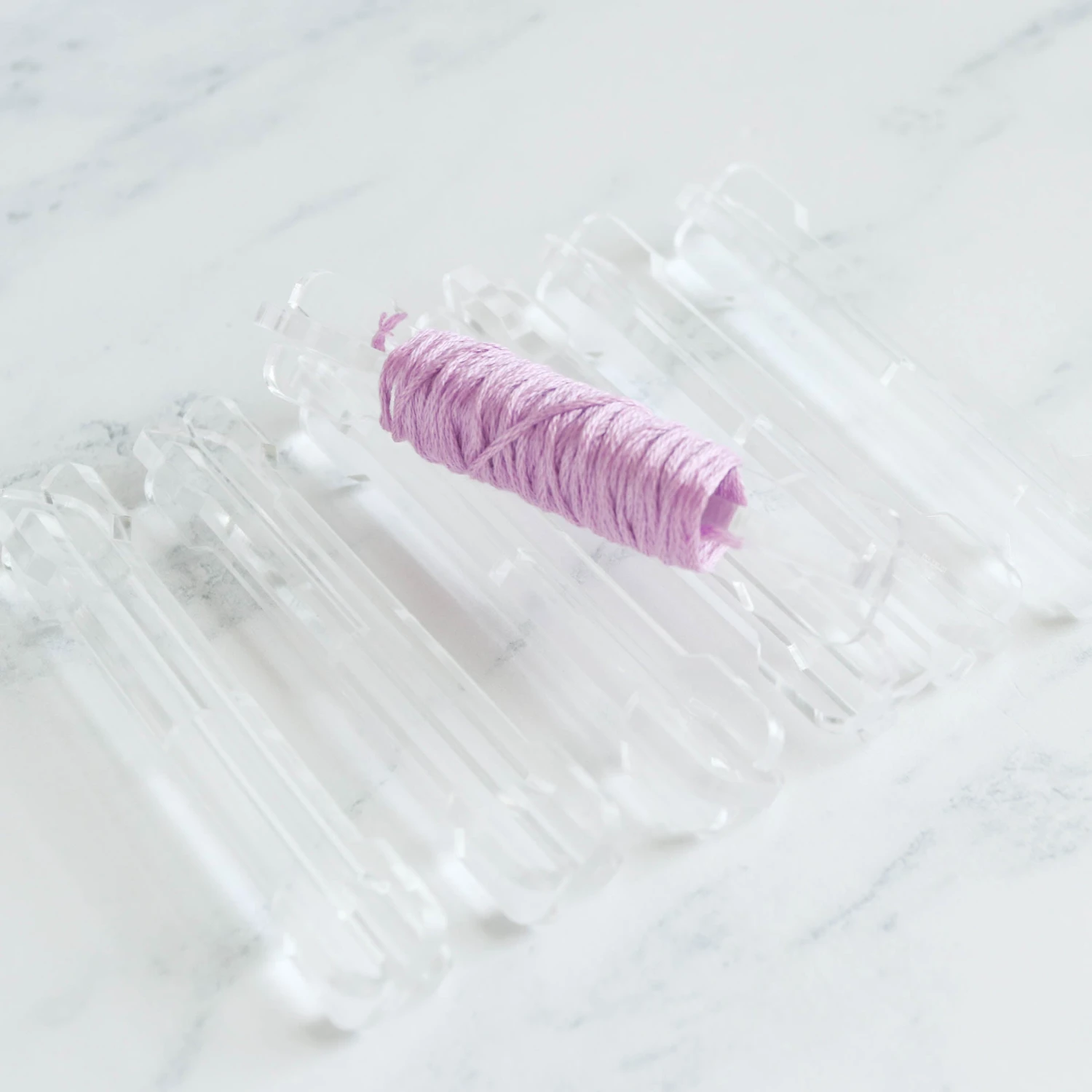 These acrylic bobbin pegs are a great organizational solution for thread and floss. Particularly useful for pearl cotton and threads that come in twisted skeins, these bobbin pegs let you store thread without kinks, and it’s super easy to unwind just the length you need. The loose end can be secured at either end of the bobbin.
