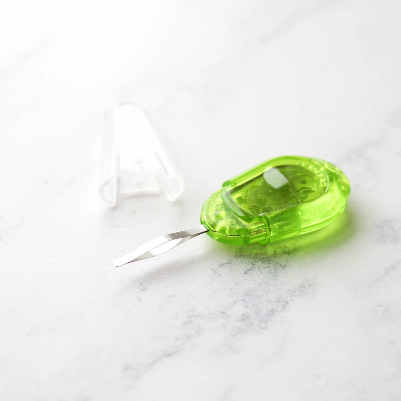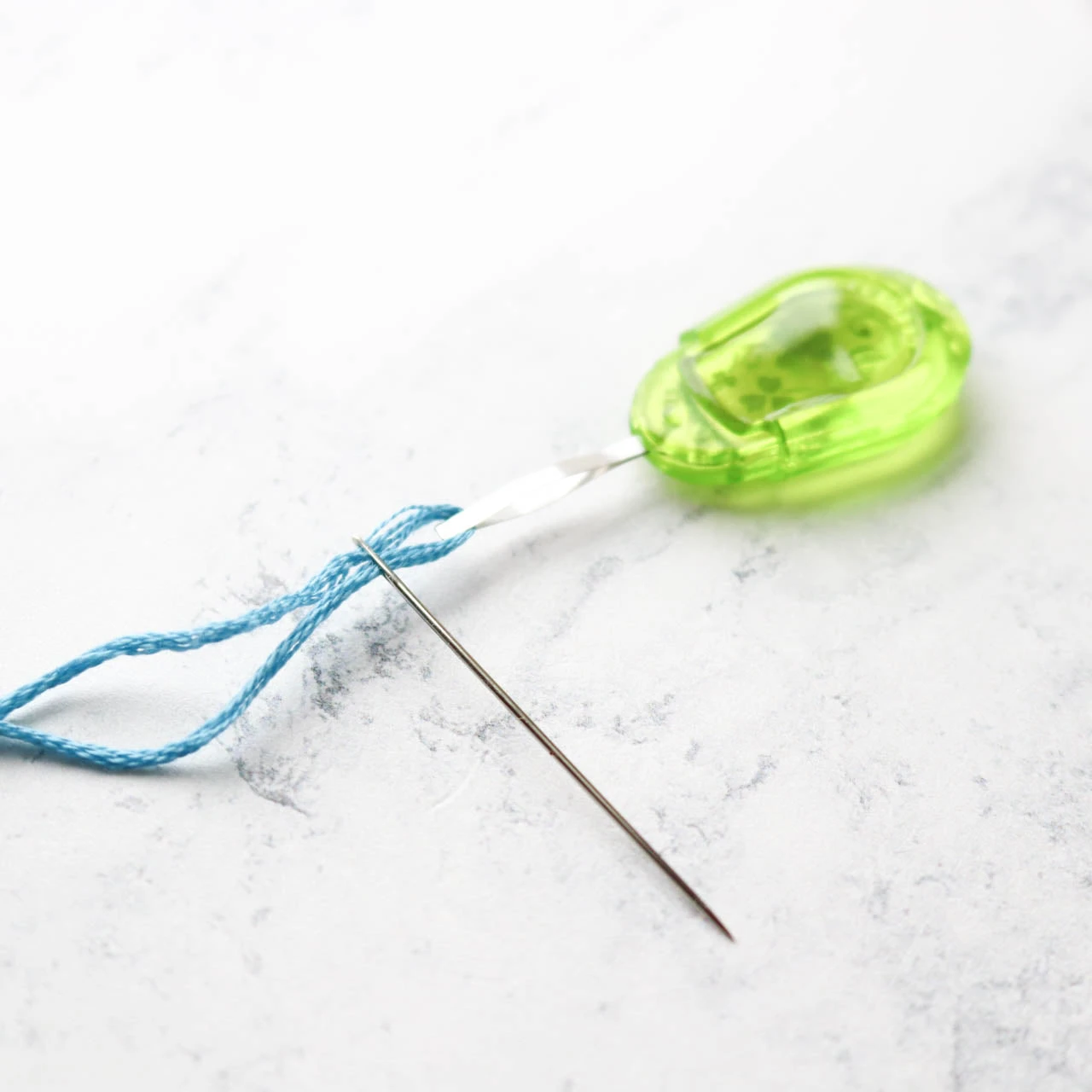 This clever needle threader is perfect for embroidery. The flat metal tip is flexible and small enough to fit through the eye of most embroidery needles. The design makes it simple to pull through even thick threads smoothly and easily.