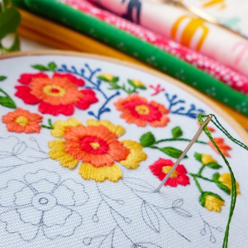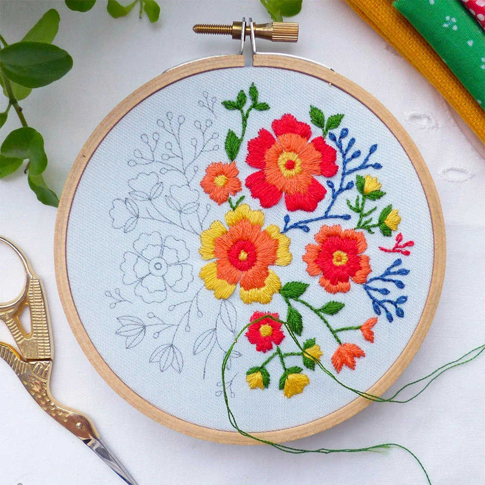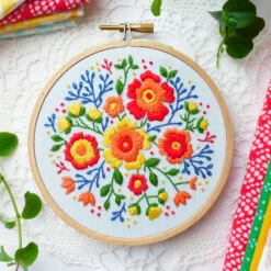 Each embroidery pattern uses several types of stitches. The designs are screen printed onto the fabric, so you can start stitching right away. A guide showing suggested stitches and colors is included.