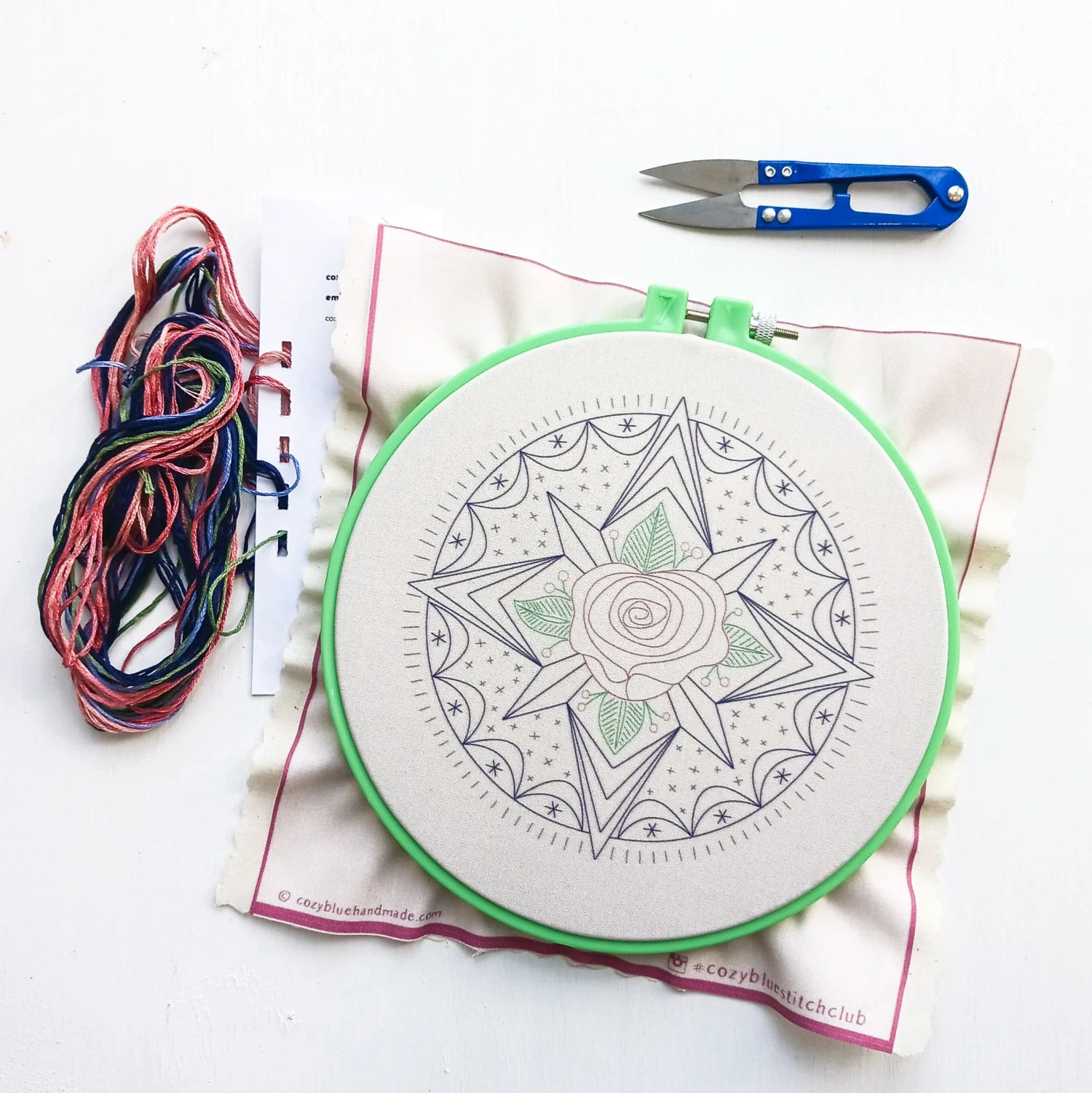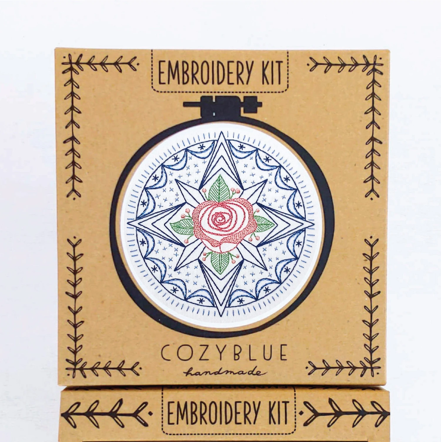This hand embroidery kit is based on the hand illustrations by North Carolina-based artist Liz Stiglets of cozyblue. Her popular designs are inspired by home, family, nature, and life’s simple wonders. This nautical-inspired pattern features a bold compass rose with a floral centerpiece.
