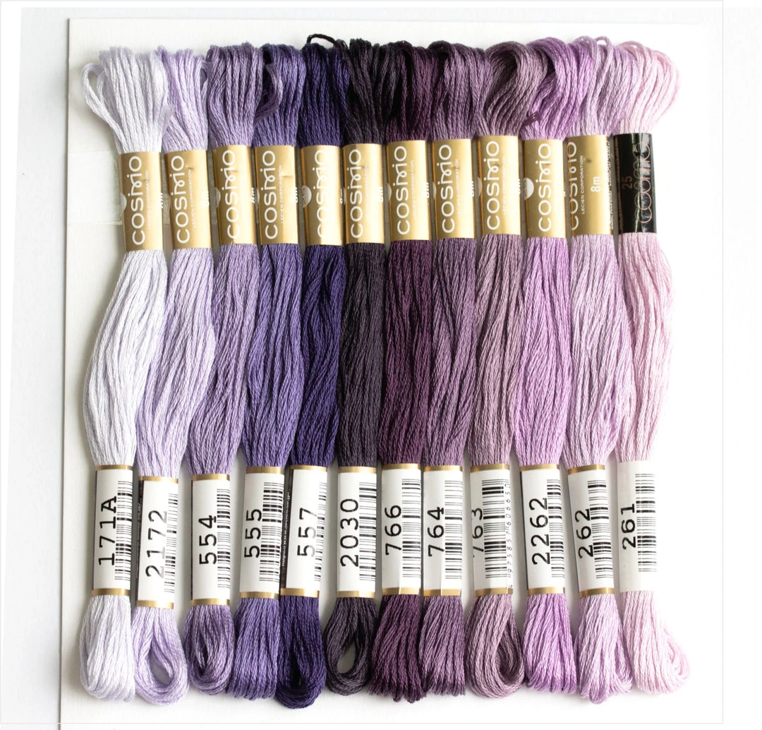 Cosmo floss is exceedingly smooth to stitch with, and the colors are especially vibrant. As a divisible 6-strand floss, it can be used for cross stitch and hand embroidery. This palette is particularly useful for creating smooth gradients of color, for example when needlepainting.
