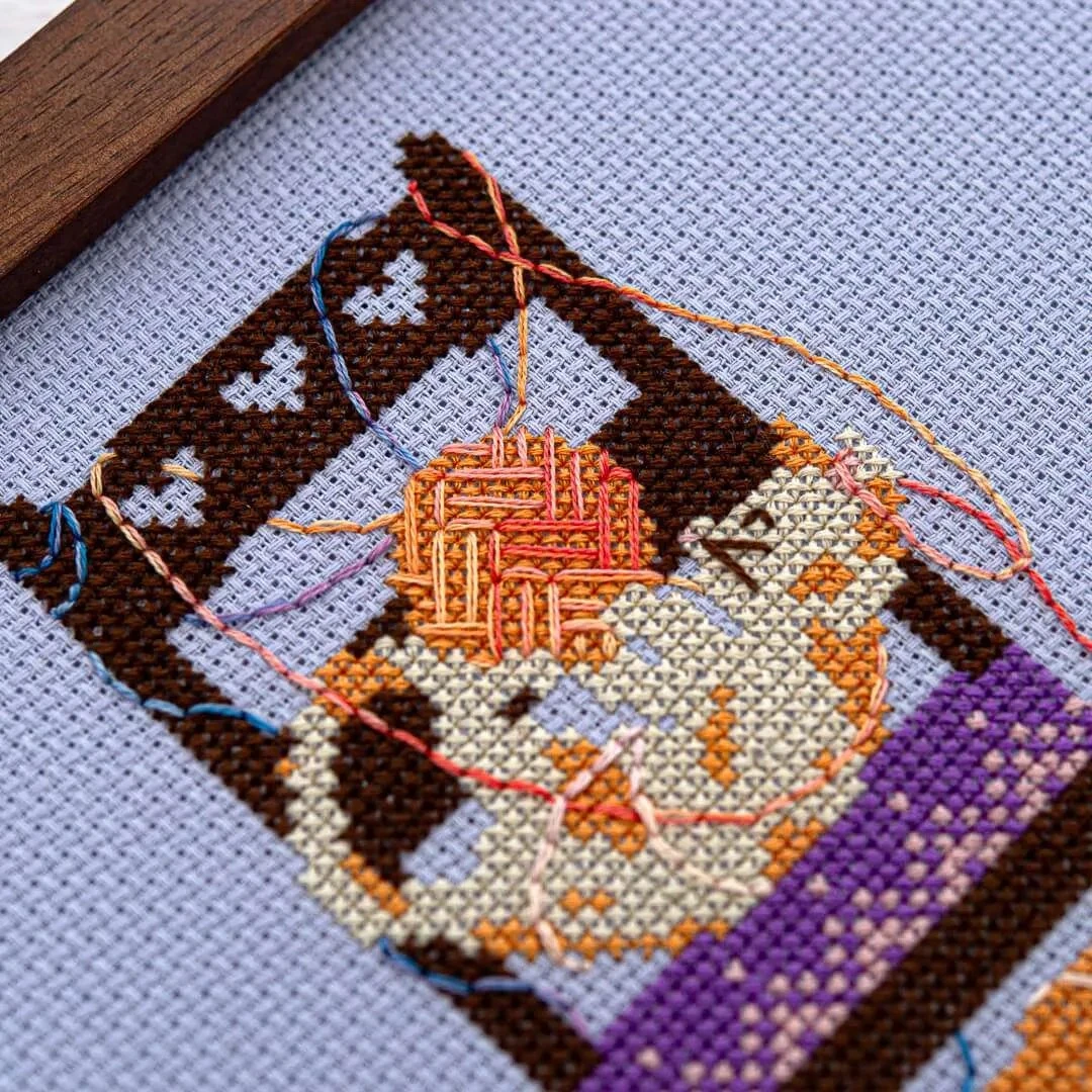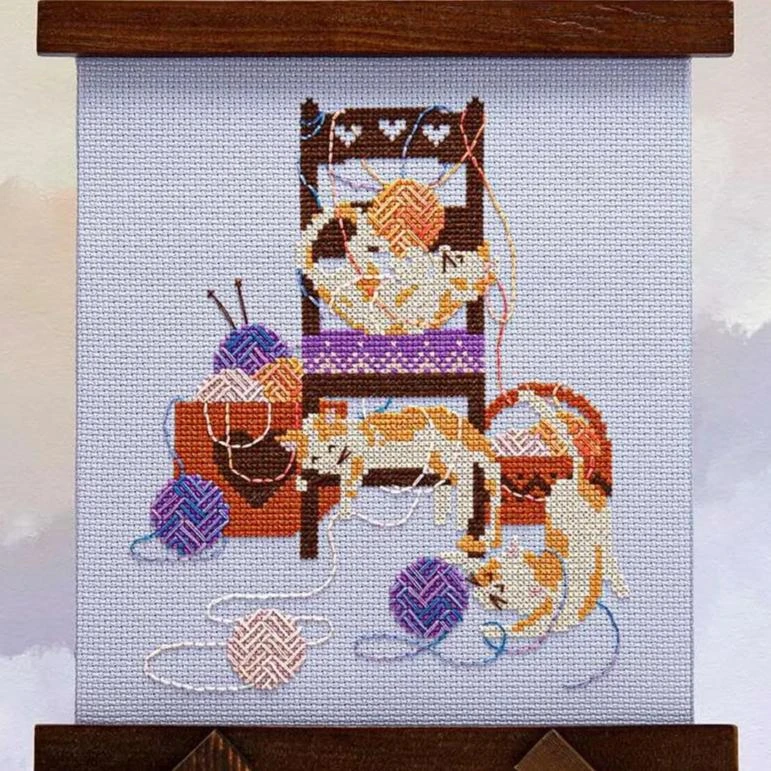 Knitters aren’t the only ones who love yarn in this colorful, modern counted cross stitch pattern by Counting Puddles. The design features three cute cats playing with balls of yarn on and around a comfy chair… and they or may not be making a bit of a mess. The yarn detailing makes use of three beautiful variegated threads. Stitch it up using cross stitch and back/straight stitch.