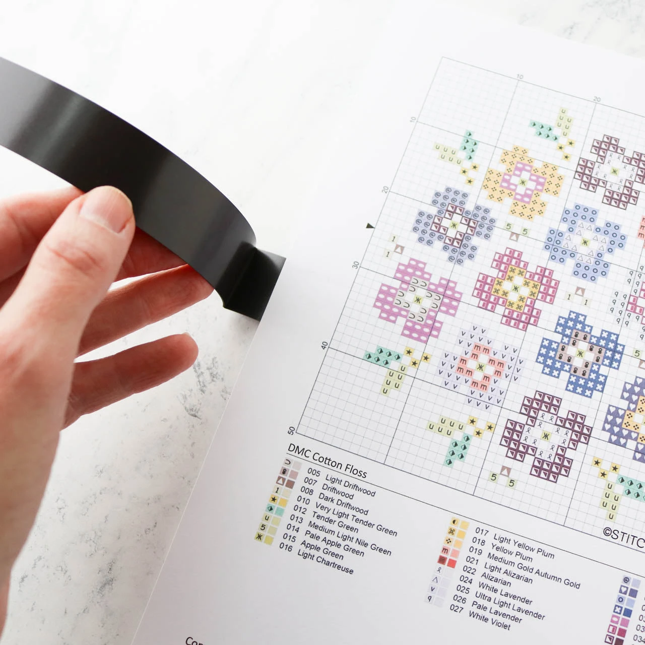 Never lose your place in a cross stitch chart again! These magnetic line keepers attach to a printed chart, so you can easily see exactly where you are at all times. The flexible magnet folds in half to sandwich your chart and stay in place, so you can use these line keepers without needing a magnet board or other chart holder.