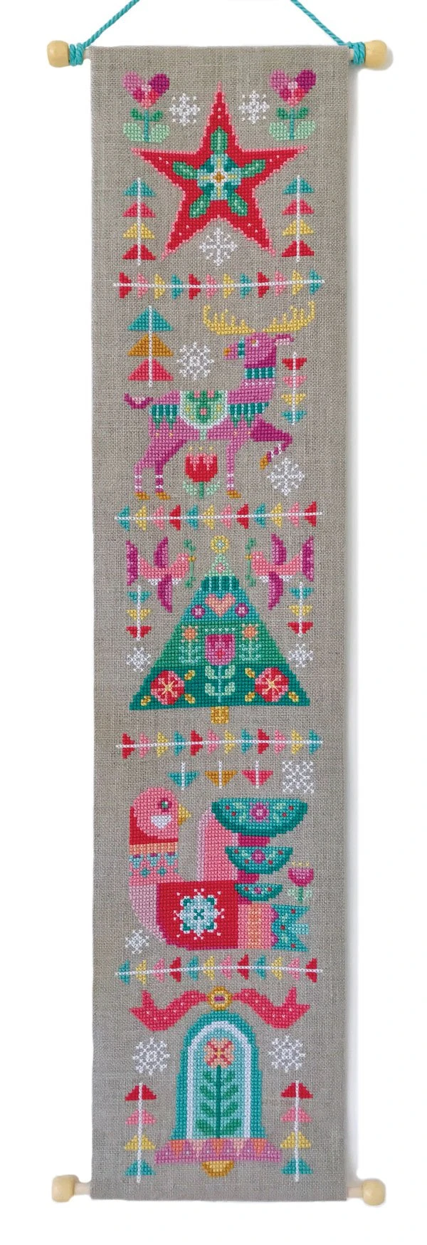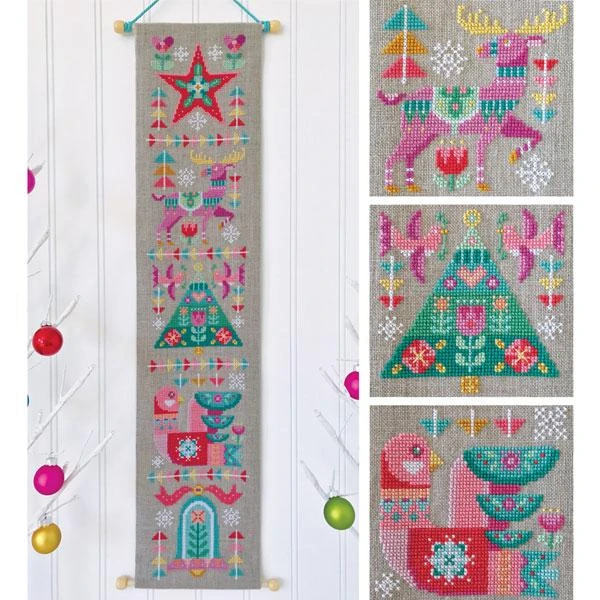 Deck your halls in style this year with Satsuma Street’s festive Christmas wall hanging. This design features a colorful star, reindeer, bird, bell, and tree. You can stitch them all together in one long hanging, or as separate motifs. Finishing instructions are included.