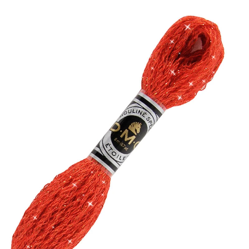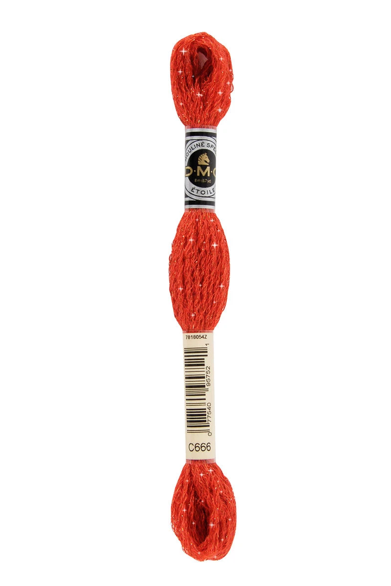 Étoile thread is available in 35 different colors. The colors coordinate seamlessly with regular DMC floss colors, so it’s easy to make substitutions and add shimmer where you want it in your project. Bright Red Étoile C666 is the equivalent of regular floss #666.