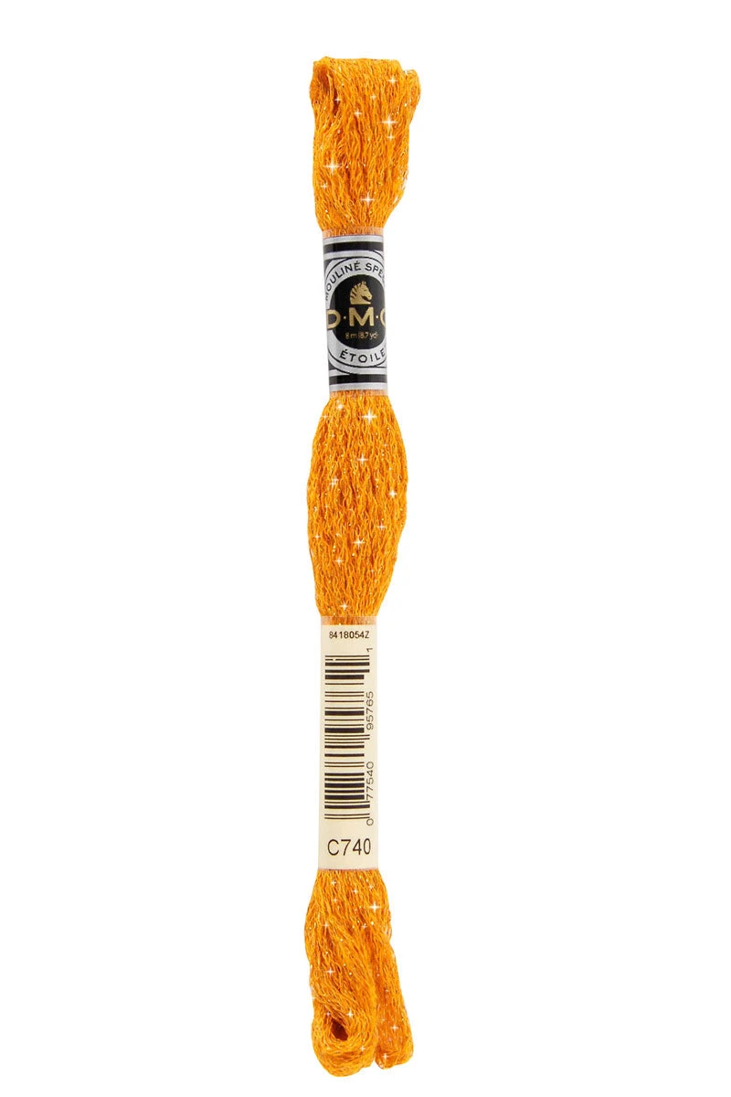 Étoile thread is available in 35 different colors. The colors coordinate seamlessly with regular DMC floss colors, so it’s easy to make substitutions and add shimmer where you want it in your project. Tangerine Étoile C740 is the equivalent of regular floss #740.
