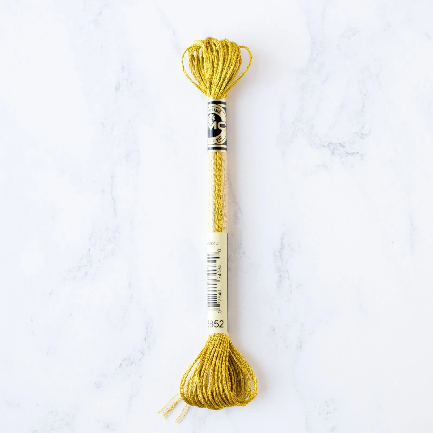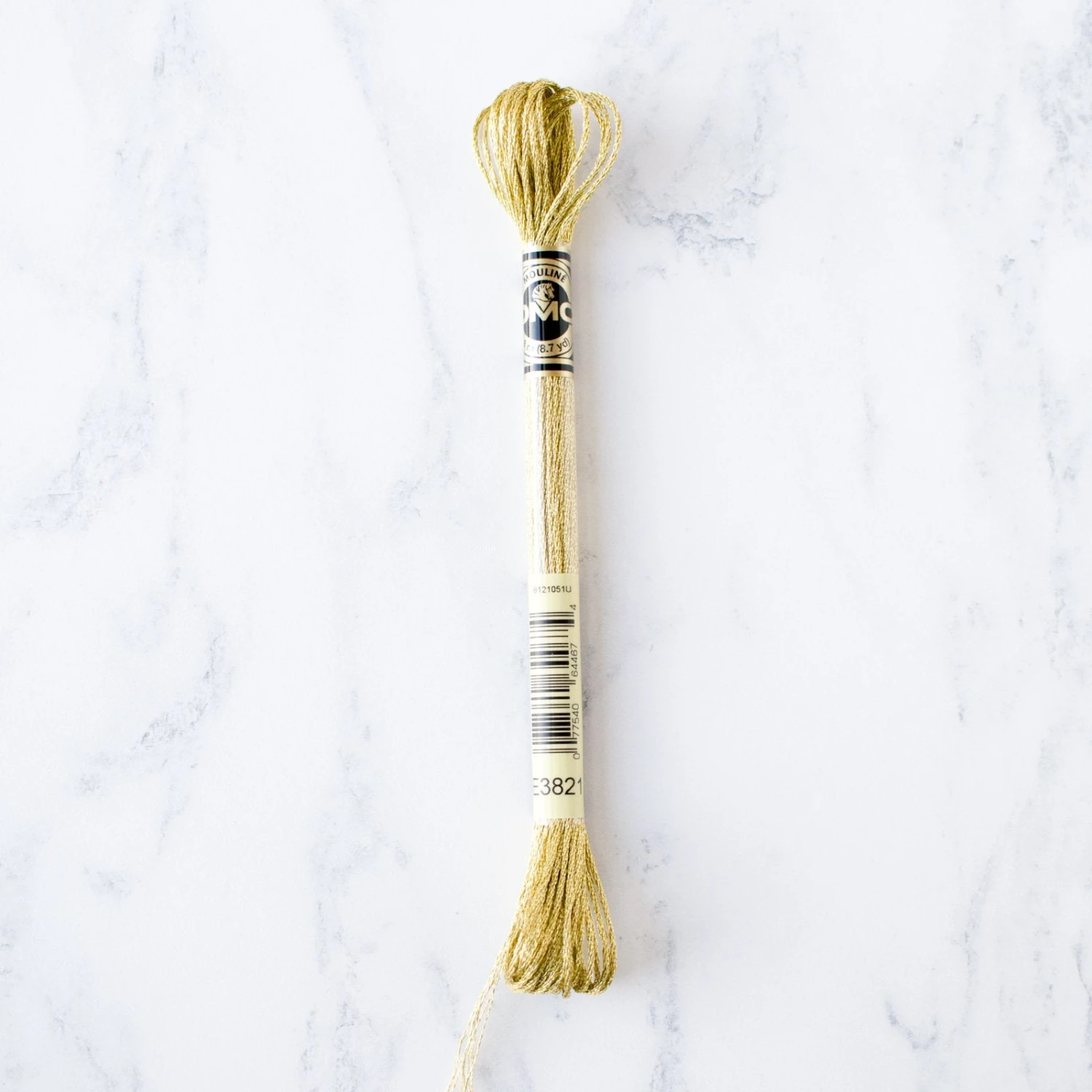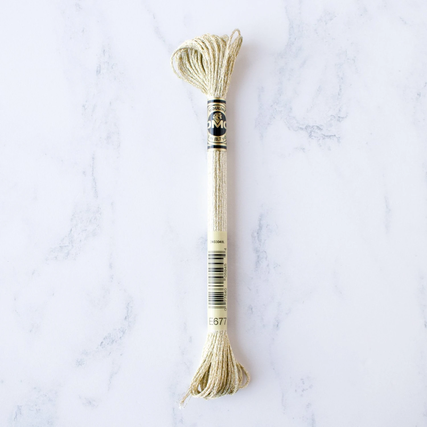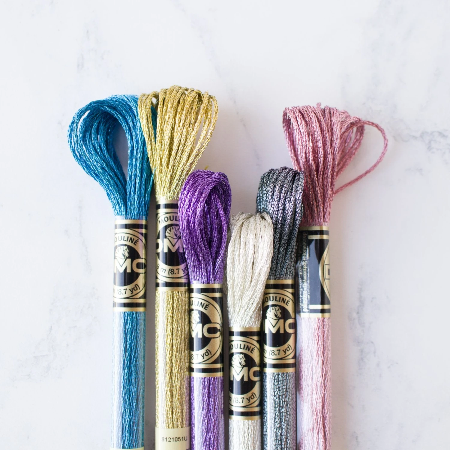 Add some sparkle to your project with DMC Light Effects embroidery floss. This metallic is a polyester/viscose blend that glimmers with a metallic shimmer. Like its cotton counterpart, the metallic floss is made up of 6 strands that are divisible, meaning depending on the fabric you are stitching on, you can separate the strands to use what you need. When stitching on 14-count Aida or 28-count linen, two strands of metallic floss usually provides the right coverage.