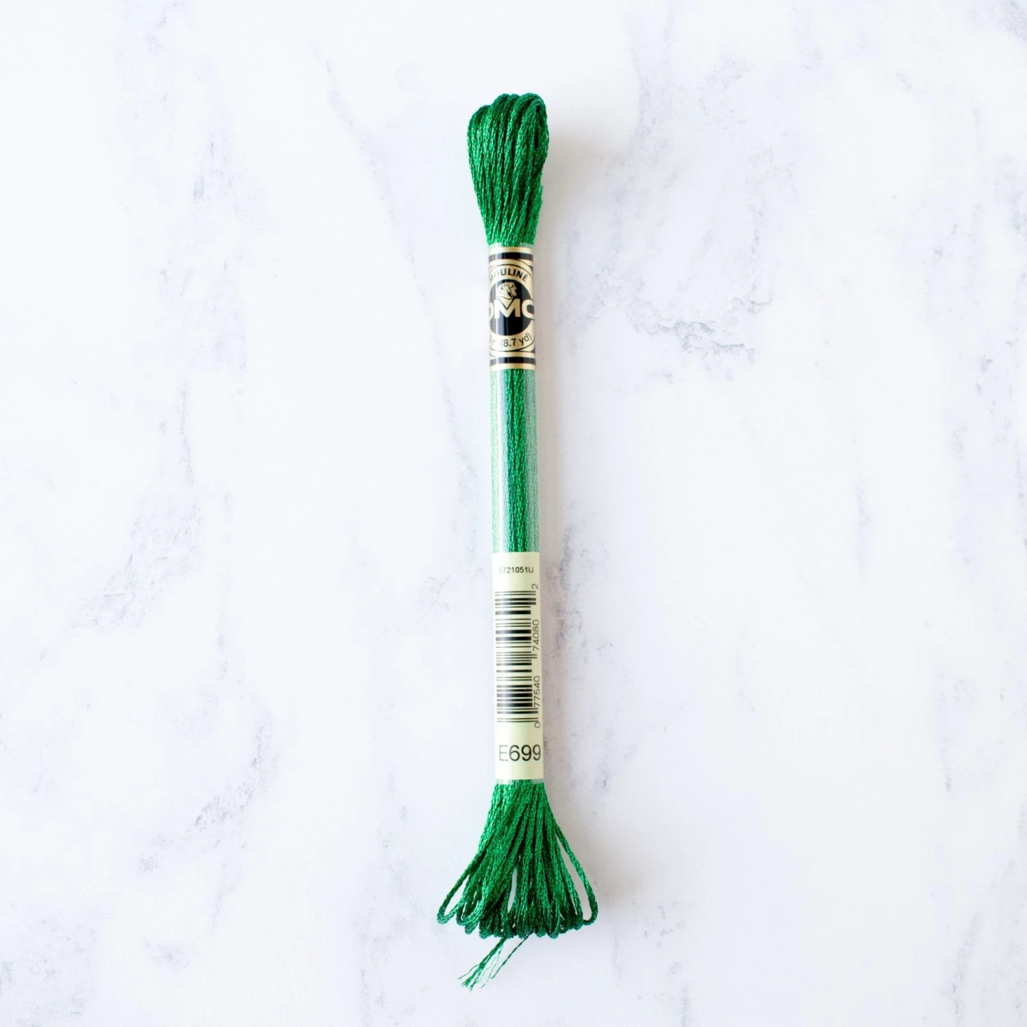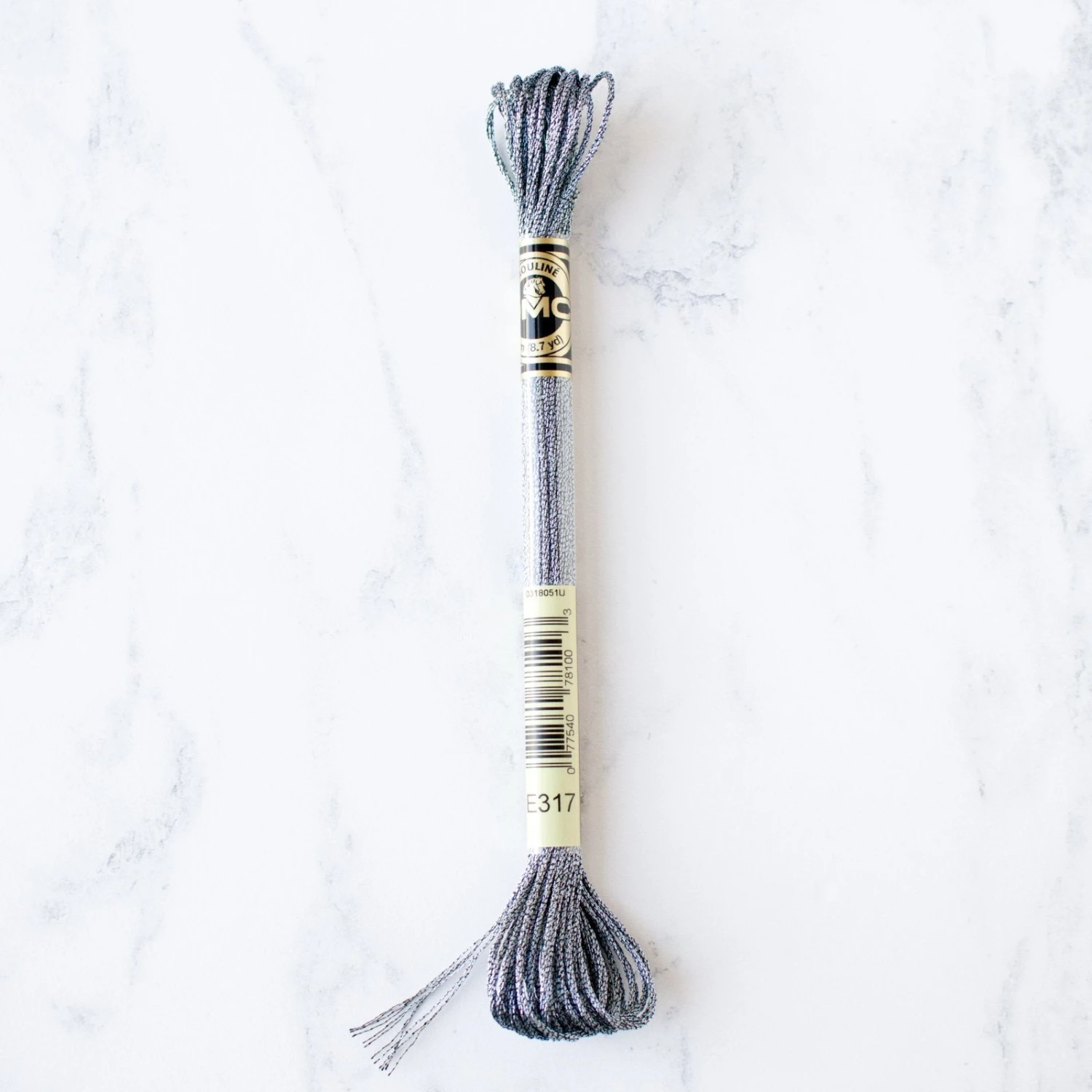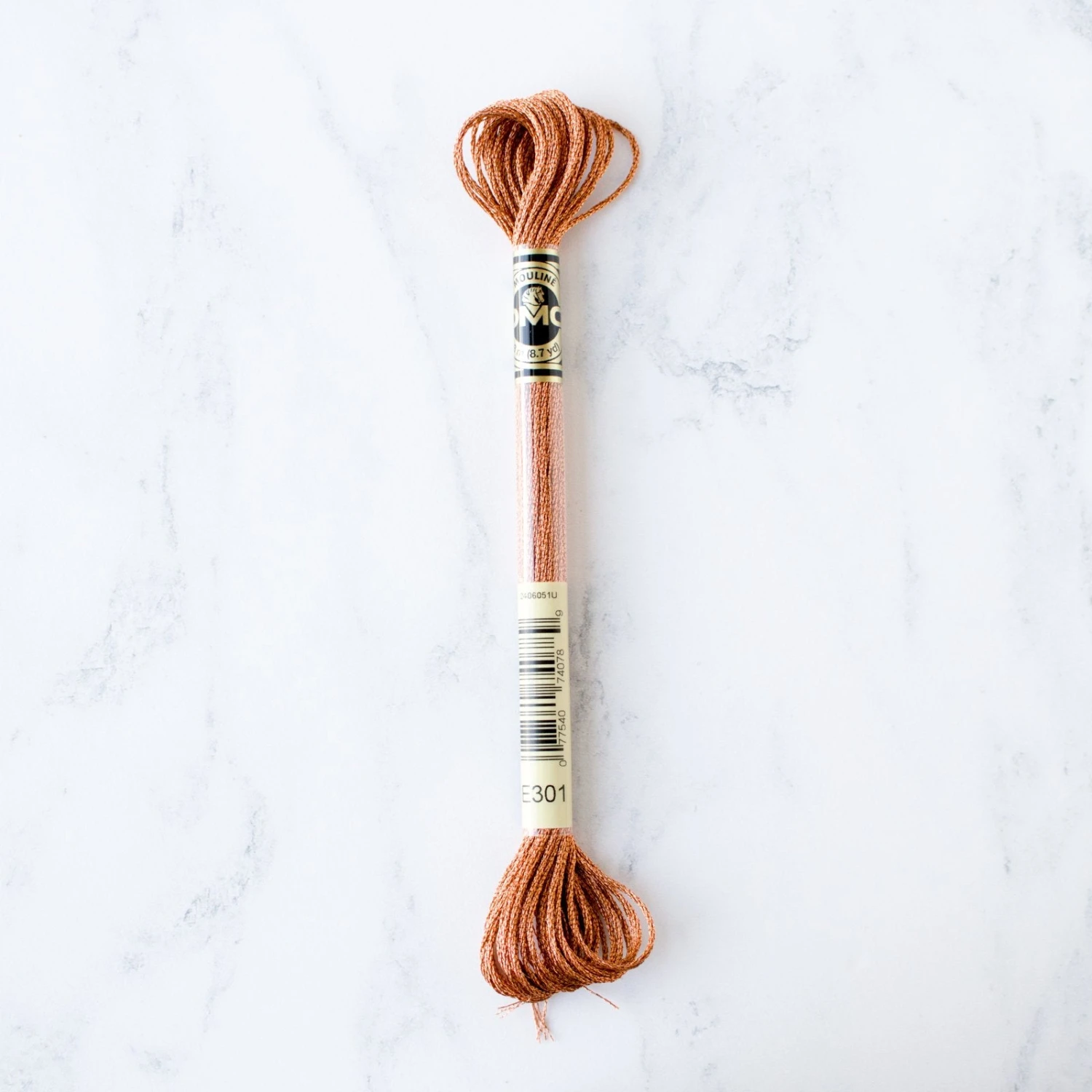 Add some sparkle to your project with DMC Light Effects embroidery floss. This metallic is a polyester/viscose blend that glimmers with a metallic shimmer. Like its cotton counterpart, the metallic floss is made up of 6 strands that are divisible, meaning depending on the fabric you are stitching on, you can separate the strands to use what you need. When stitching on 14-count Aida or 28-count linen, two strands of metallic floss usually provides the right coverage.