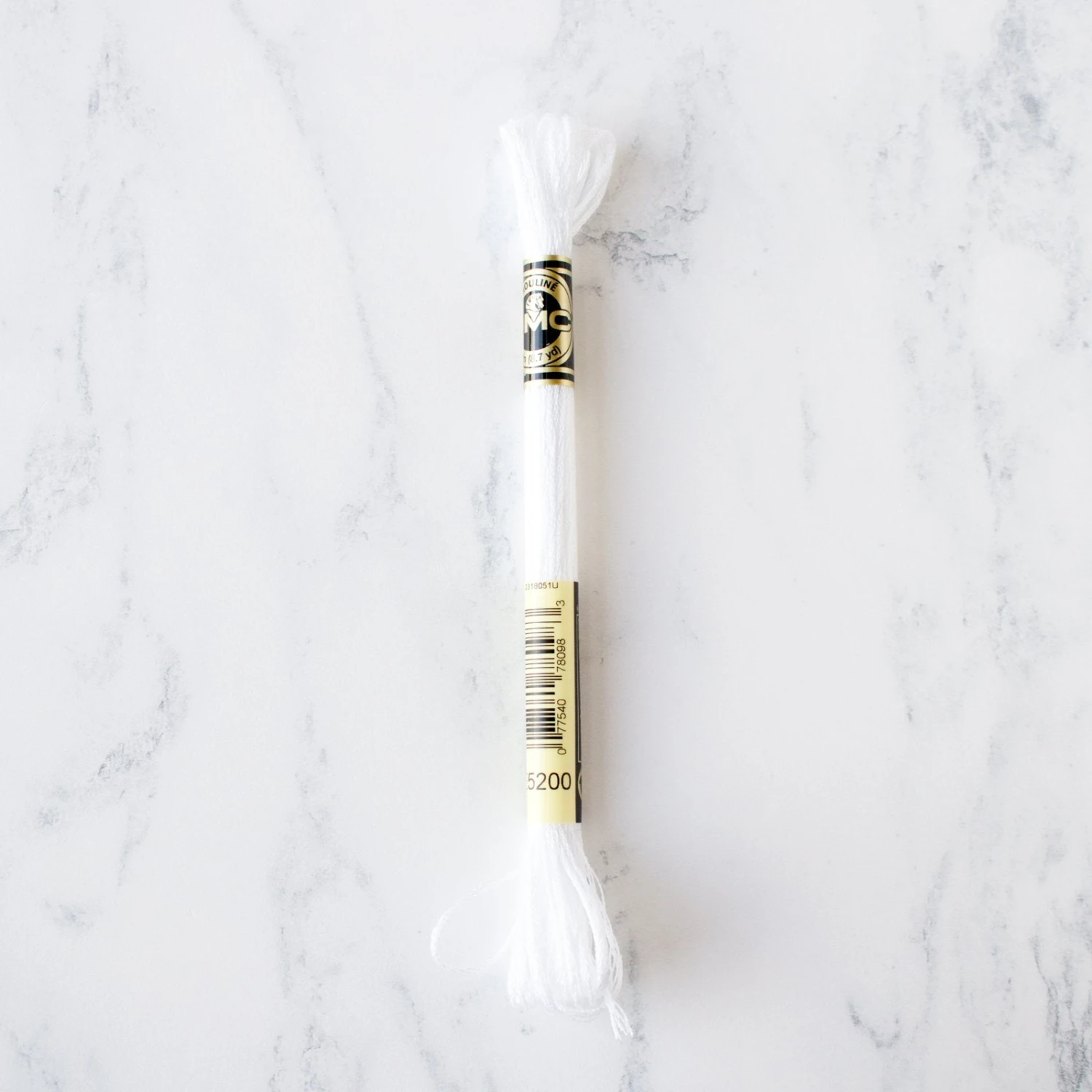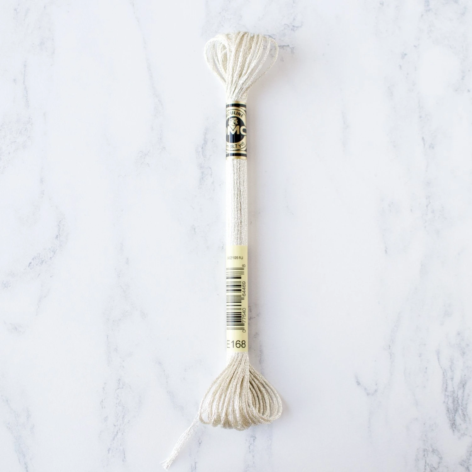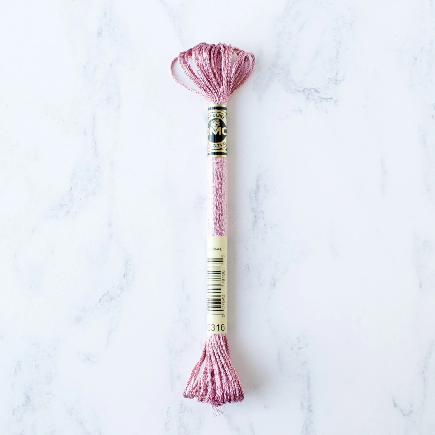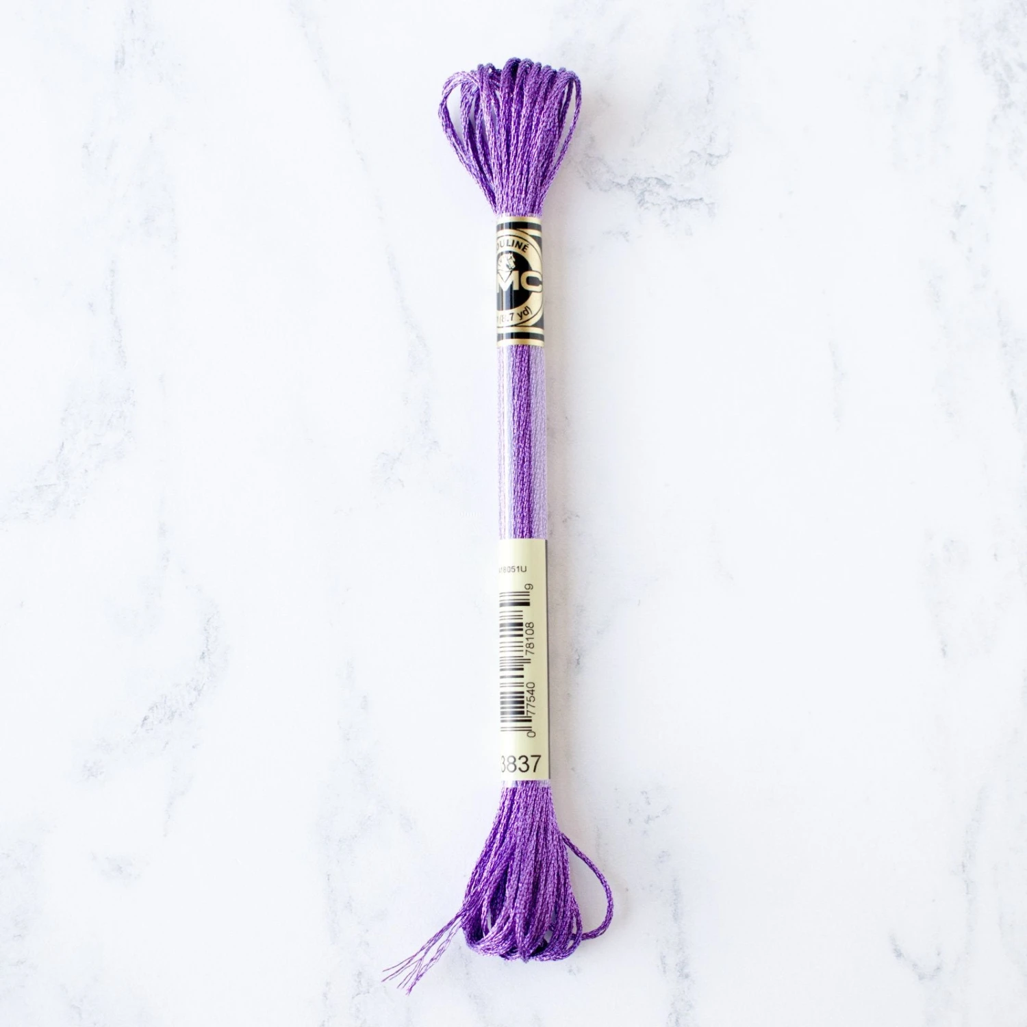 Add some sparkle to your project with DMC Light Effects embroidery floss. This metallic is a polyester/viscose blend that glimmers with a metallic shimmer. Like its cotton counterpart, the metallic floss is made up of 6 strands that are divisible, meaning depending on the fabric you are stitching on, you can separate the strands to use what you need. When stitching on 14-count Aida or 28-count linen, two strands of metallic floss usually provides the right coverage.
