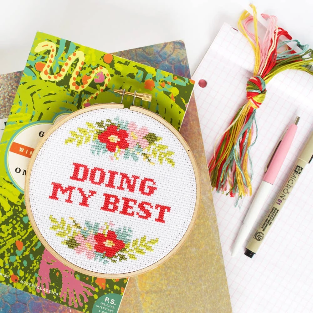 Doing My Best, a mantra for our times. This kit is the perfect morale booster when you need that reminder. Created by The Stranded Stitch, the pattern uses only full cross stitches, so it’s perfect for those new to cross stitch, but the fun design will appeal to stitchers of all levels.