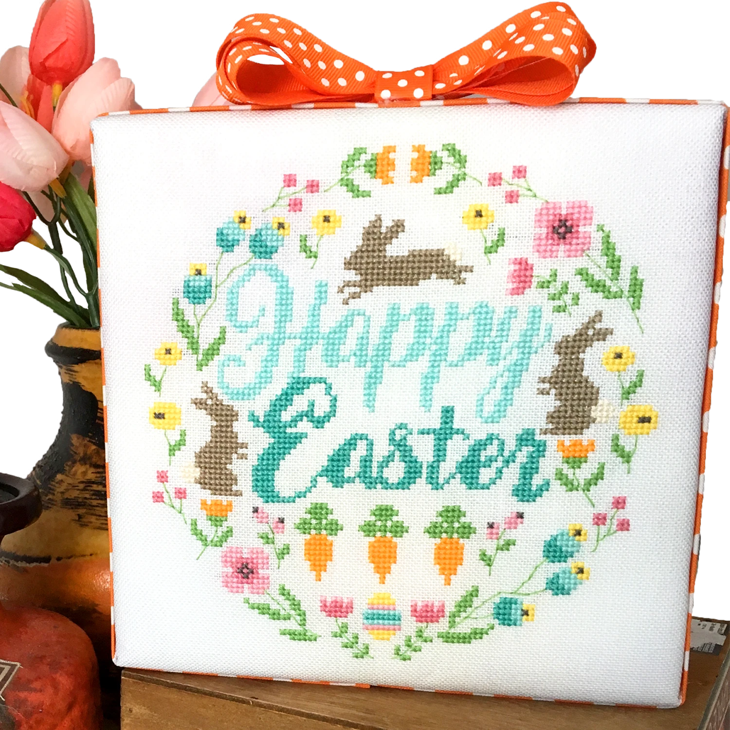 Brighten your spring with this joyful Easter wreath design from Tiny Modernist. Framed by a ring of pastel flowers, cheerful carrots, and playful bunnies, the hand-lettered “Happy Easter” greeting takes center stage in fresh aqua tones. It’s a sweet and colorful celebration of the season.
