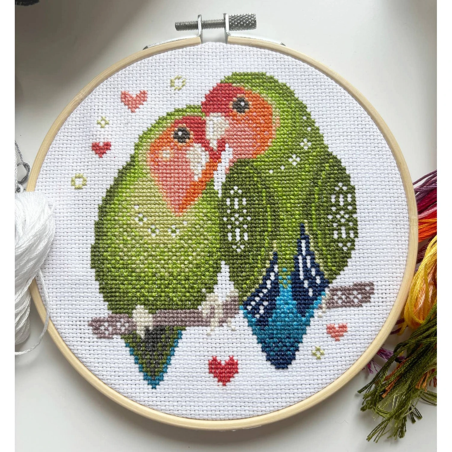 Celebrate love and companionship with this charming cross stitch design by UK-based Love Poppet that features two affectionate lovebirds nestled together. Their vibrant plumage pops against the background, with delicate hearts adding a sweet touch to the scene.