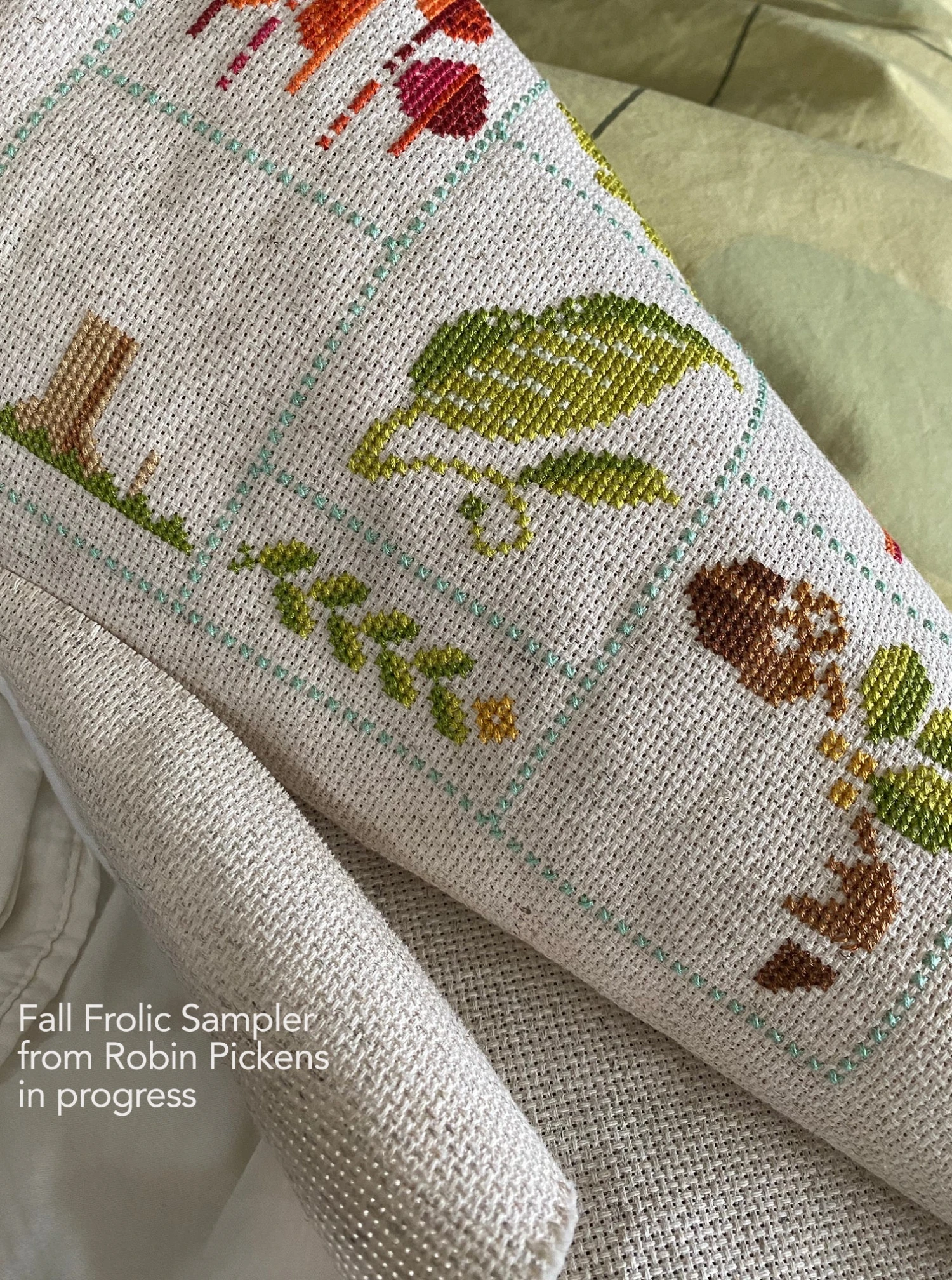 This counted cross stitch pattern by Robin Pickens has lively warm colors and an assortment of leaves, mushrooms, acorns and a sweet Robin bird.
