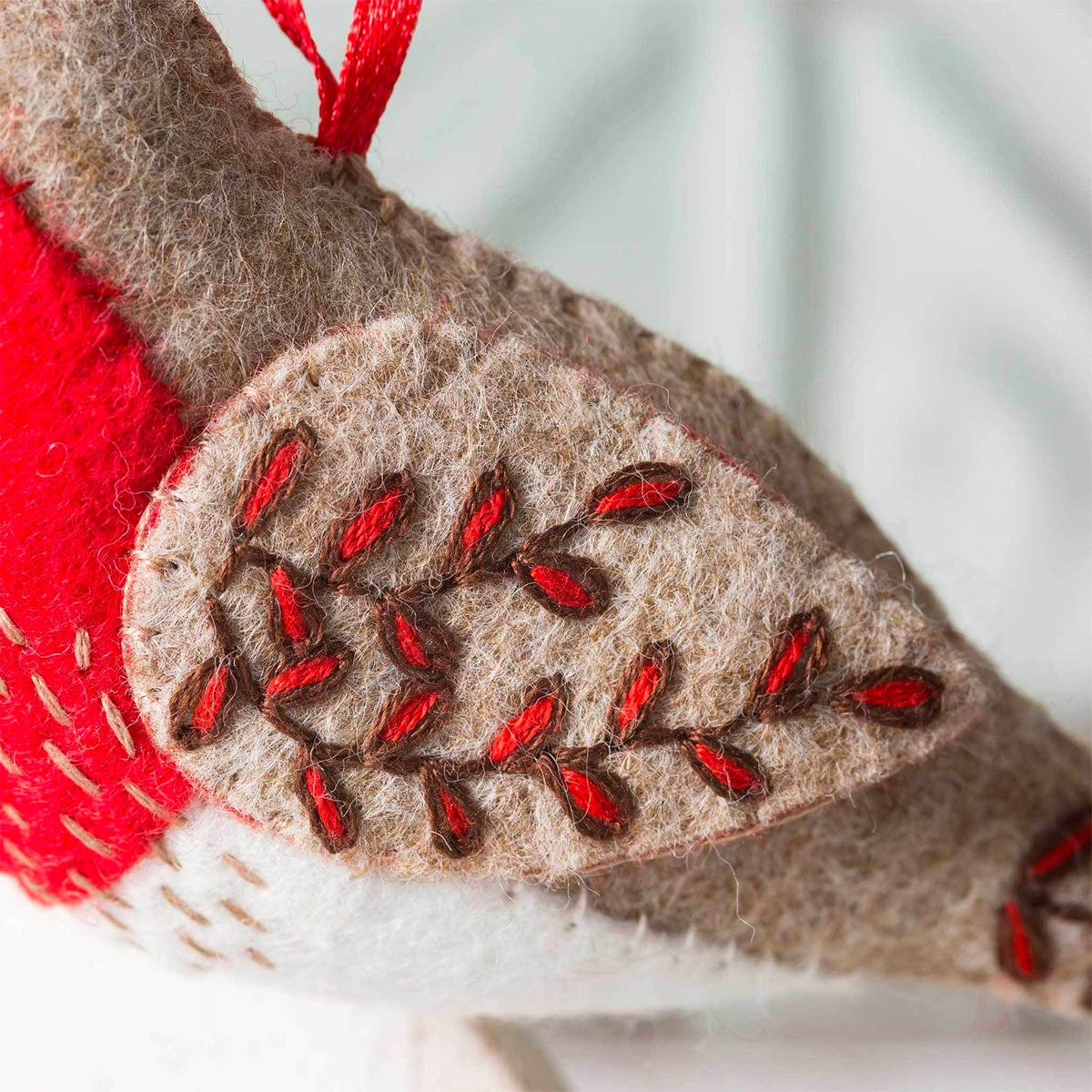 Our charming embroidered Robin mini craft kit contains everything you need to make one felt hanging decoration. A feathered friend in winter and the festive season, he is too sweet to put away come spring. Detailed instructions will help you bring the project delightfully to life.