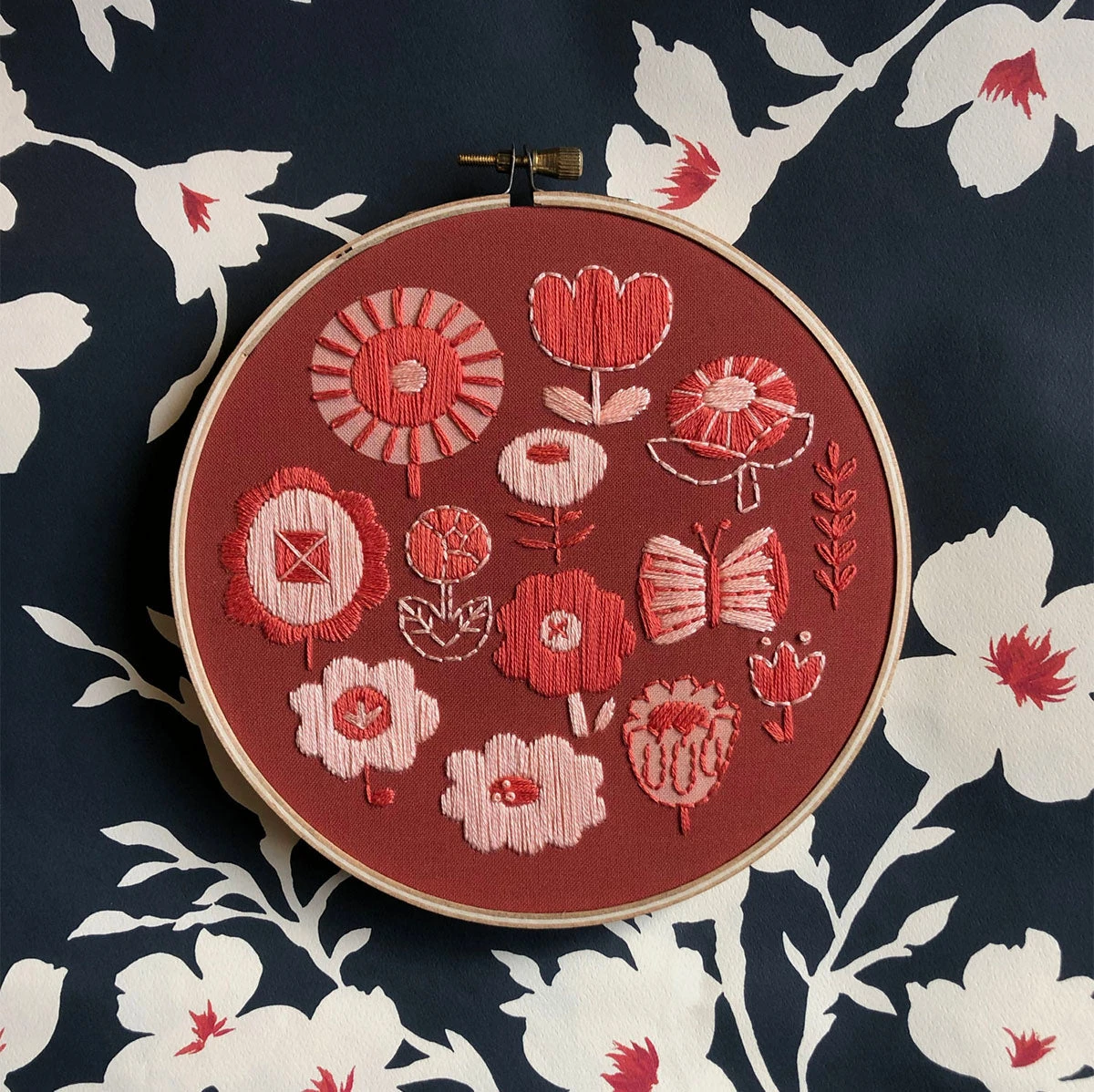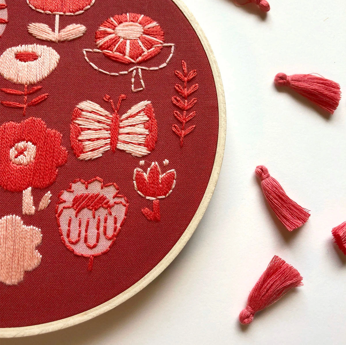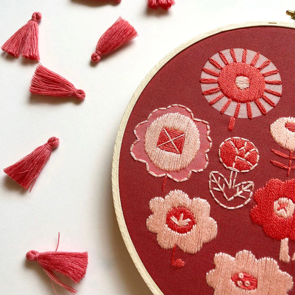 Two shades of coral floss is used over deep coral warm red background. Some of the light and dark coral fabric is left unstitched to add to the contrast of the design as well as making it simpler to stitch.