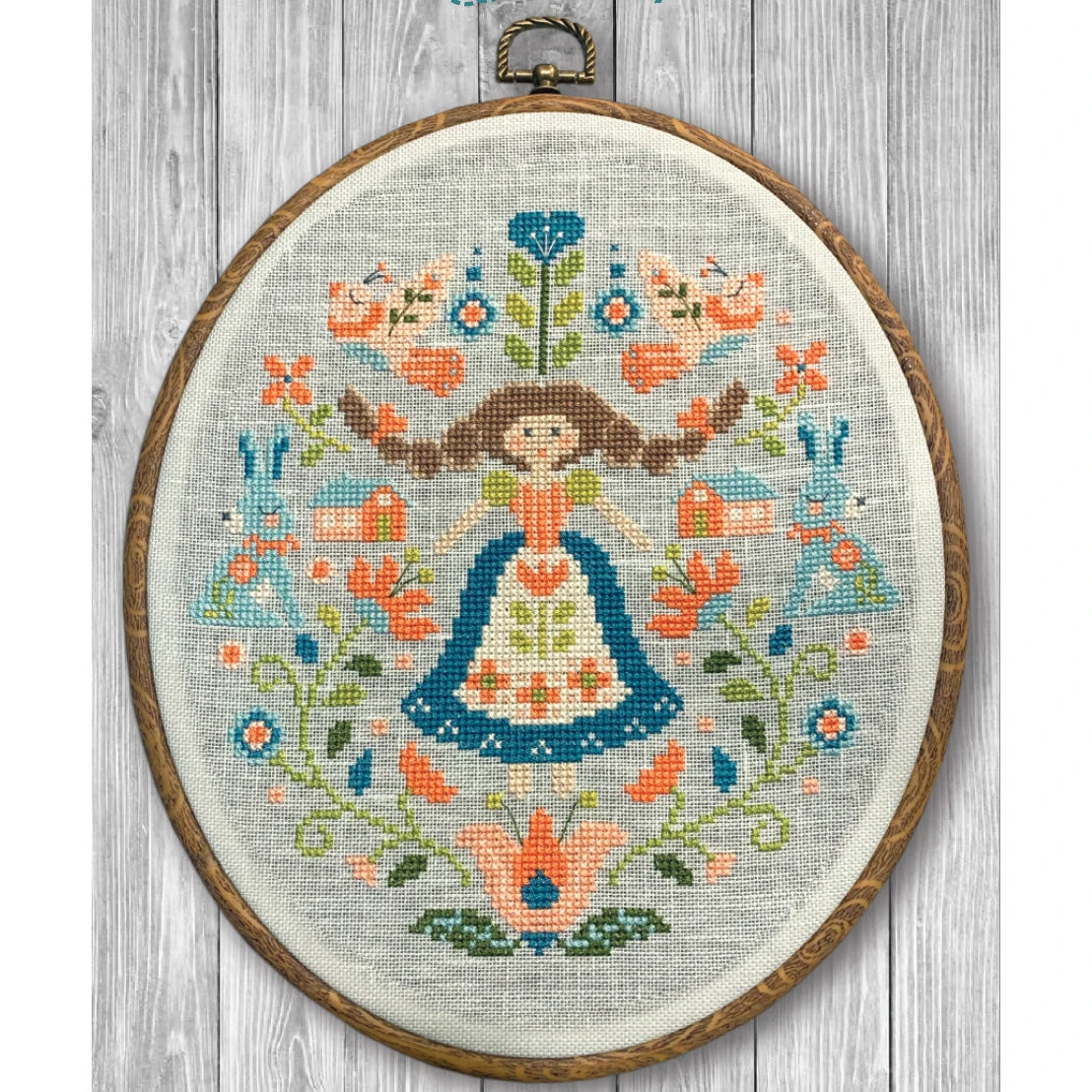Celebrate the charm of traditional stitching with this Folk Art cross stitch pattern by Tiny Modernist. Featuring a central figure surrounded by floral motifs, bunnies, birds, and cozy homes, this whimsical design blends vibrant colors with symmetrical folk elements for a nostalgic, handmade feel that’s perfect for spring or any season.
