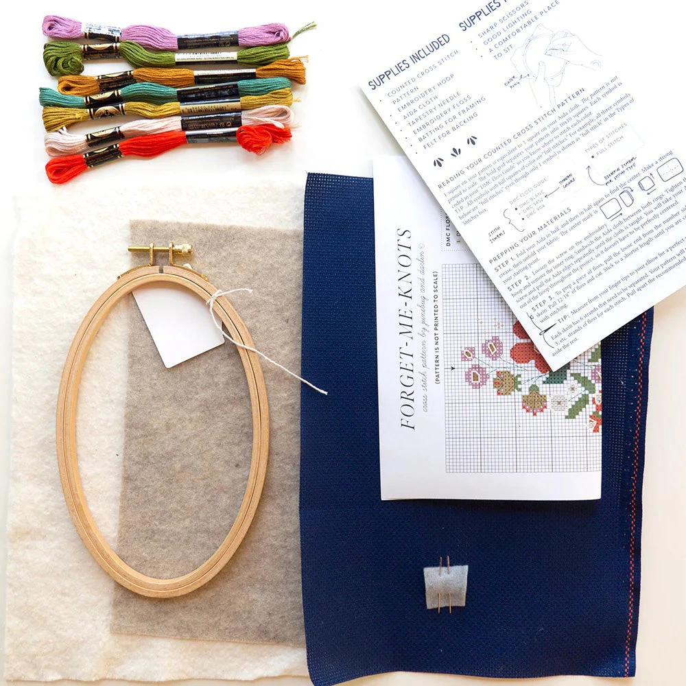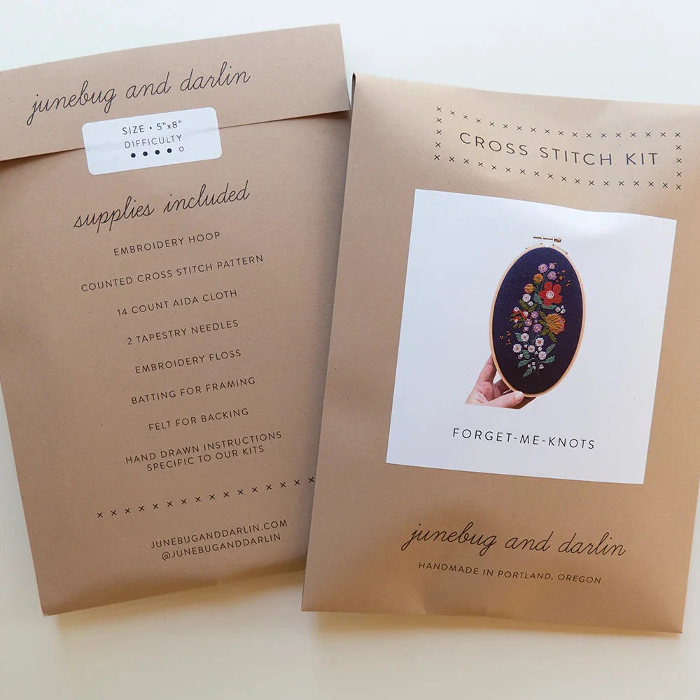 This lovely cross stitch kit by Junebug and Darlin showcases a floral bouquet of bright colored threads on navy cloth. It’s perfect for an adventurous stitcher and comes with all the necessary supplies. The finish design can be framed in the included oval embroidery hoop.