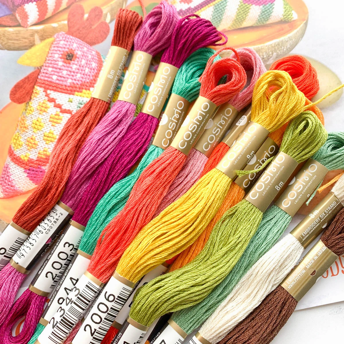 The models were stitched using Cosmo embroidery floss, which has vibrant colors and is a pleasure to stitch with. You can choose to add a Cosmo thread pack to your purchase. We also have DMC thread packs available if you prefer.