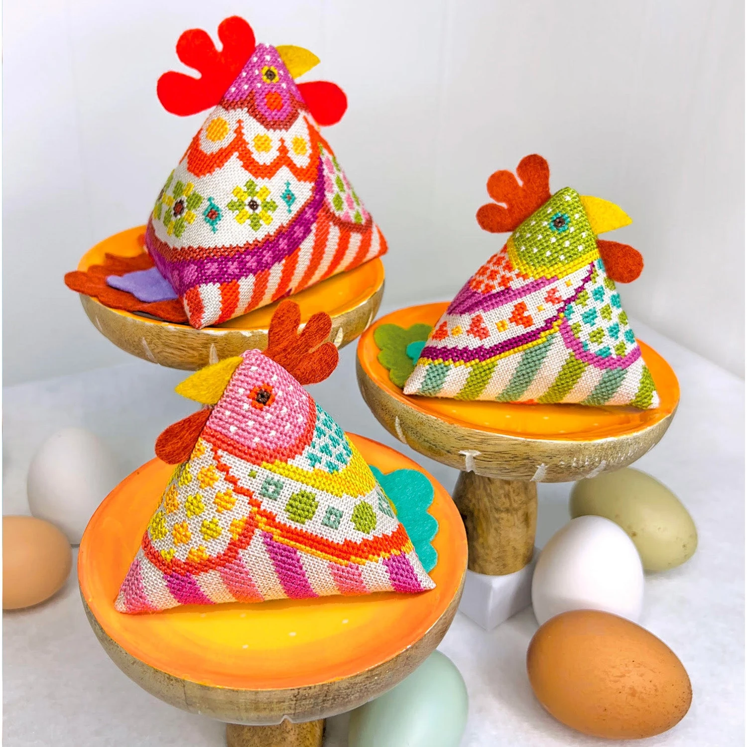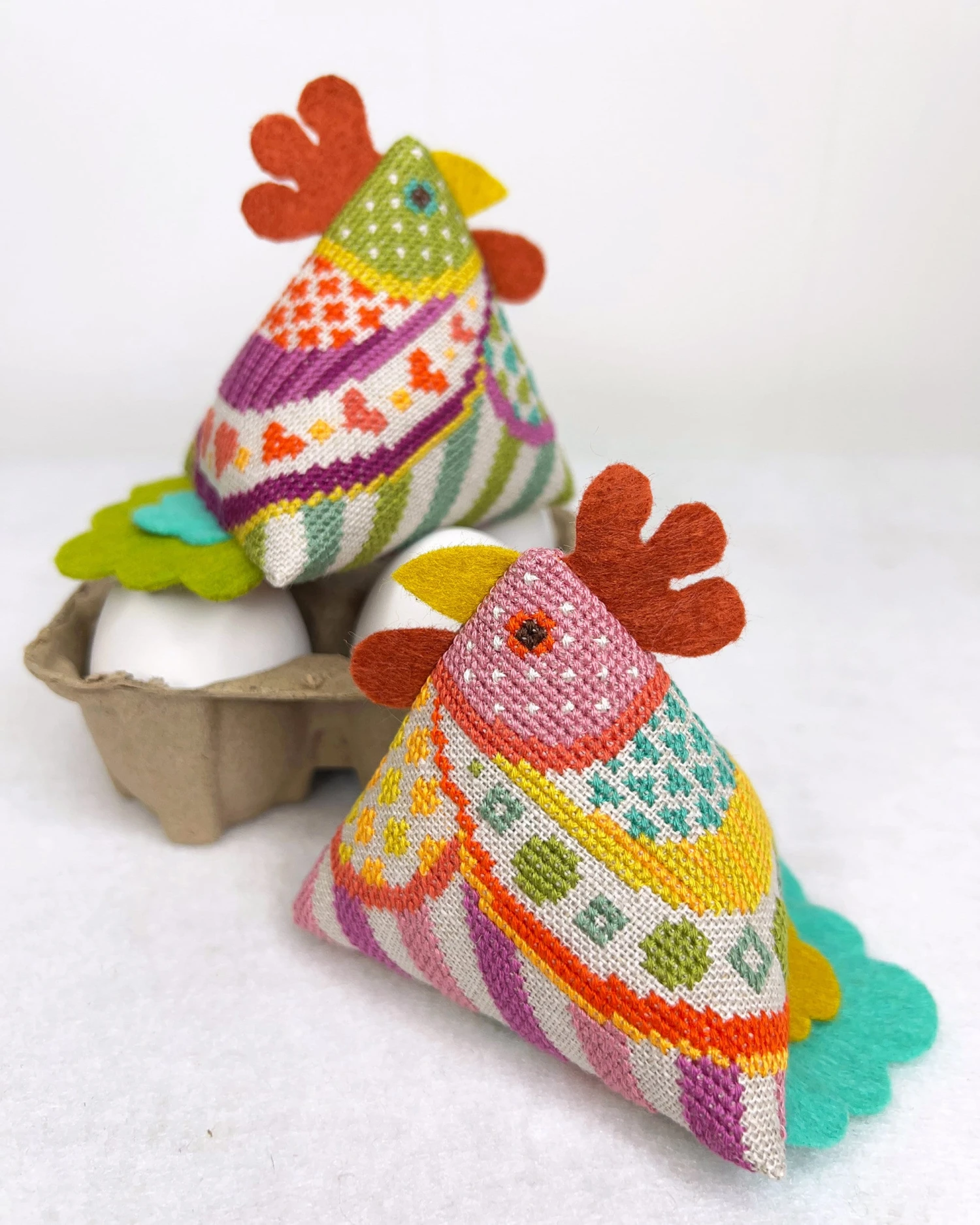 Let’s do the funky chicken! These three-dimensional chickens by Satsuma Street are made with just a few straight seams and they make striking pincushions, pattern weights, or sachets. The pattern includes all three chickens, plus illustrated step-by-step instructions and templates for felt accents.Â