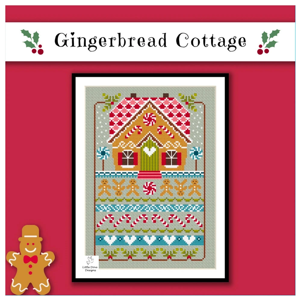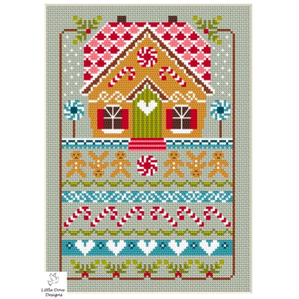 A charming gingerbread cottage takes center stage in this cross stitch pattern by UK-based Little Dove Designs. The model was stitched on gray fabric. You could do the same, or go with a neutral colored fabric. Whatever you choose, this pattern will be a joy to stitch!