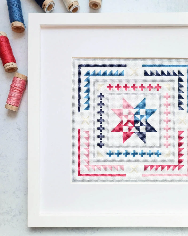 This colorful and graphic cross stitch pattern was inspired by an original quilt design by beloved brand Cotton and Joy. The finished piece can be framed in a 8″ x 8″ frame.