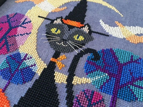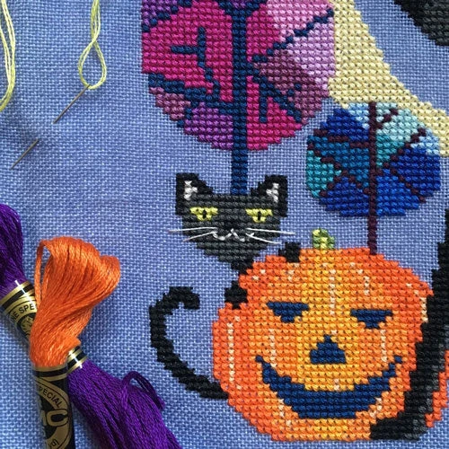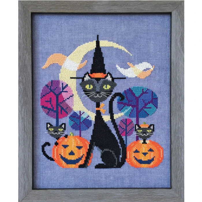 Celebrate All Hallow’s Eve in style with this sassy black cat and her two curious kittens! This vibrant cross stitch design by Satsuma Street looks striking on any colored fabric.