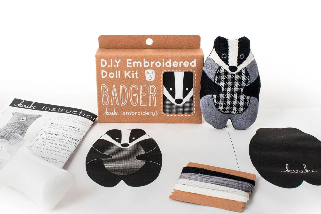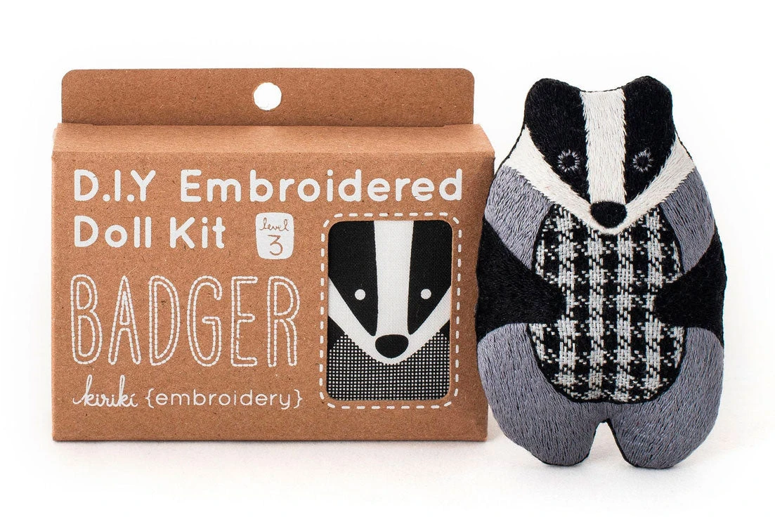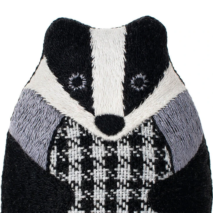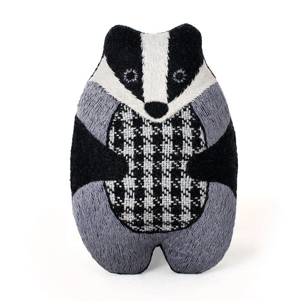The badger kit uses a variety of embroidery stitches that cover most of the surface of the pattern, so it’s perfect for adventurous beginners or seasoned stitchers. The finished plushie is approximately 4-1/2 inches tall.