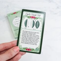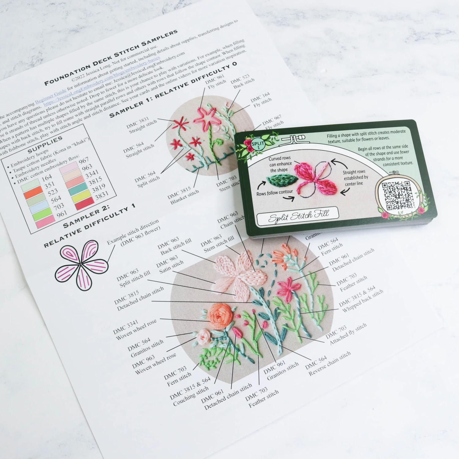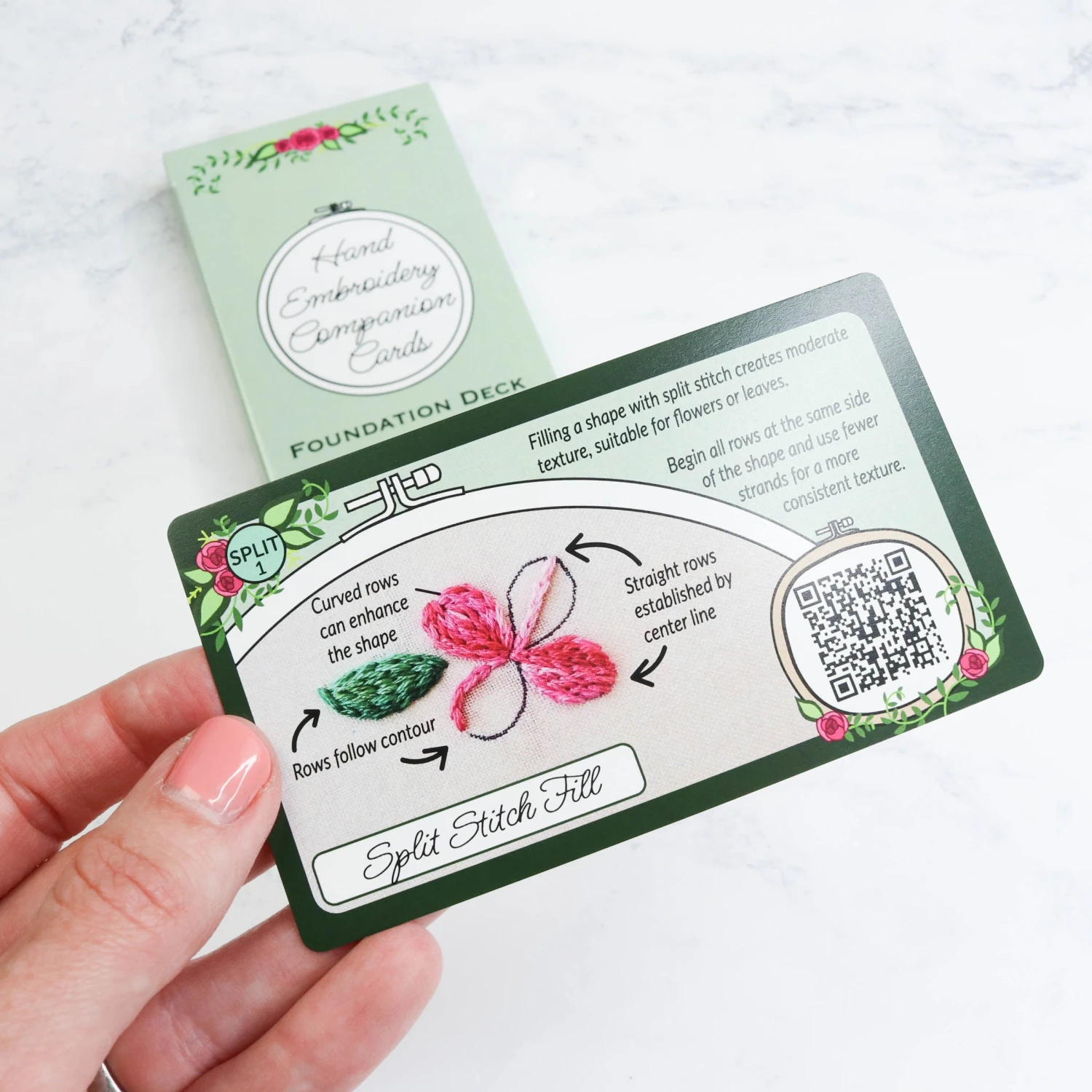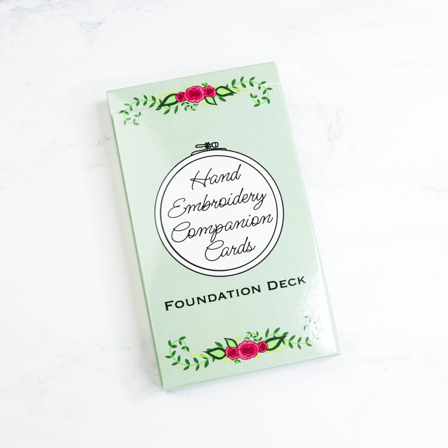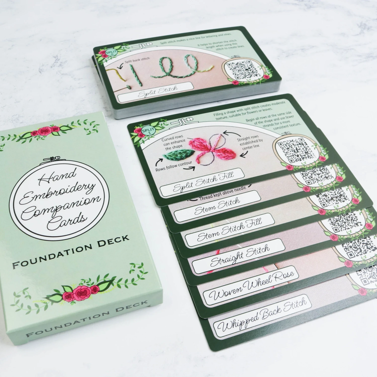 The Foundation Deck includes a deck of 31 cards: 30 foundational hand embroidery stitches plus one key card. Each stitch card includes: