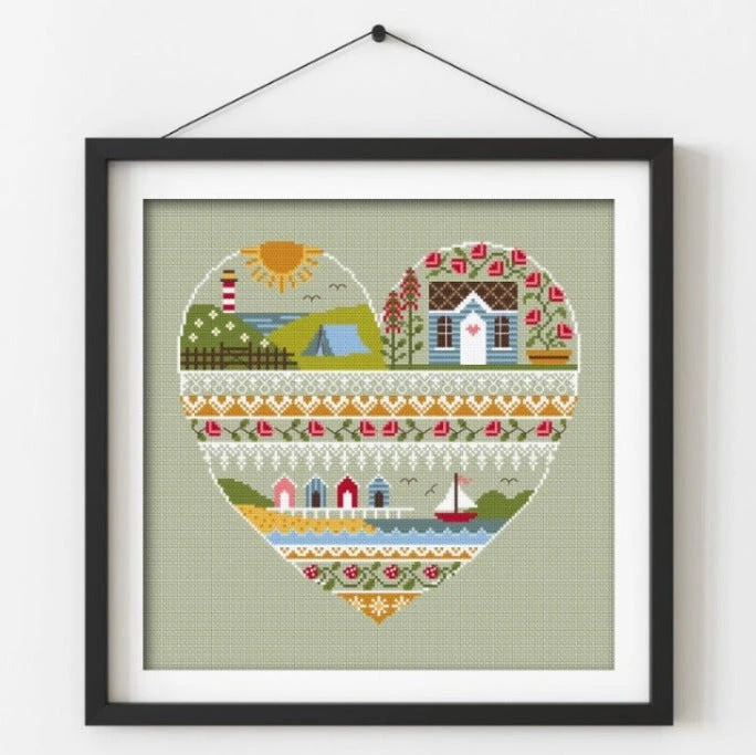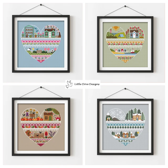 A sunny summer village is stitched within a heart in this charming cross stitch pattern by UK-based Little Dove Designs. Check out the complete seasonal heart series here.