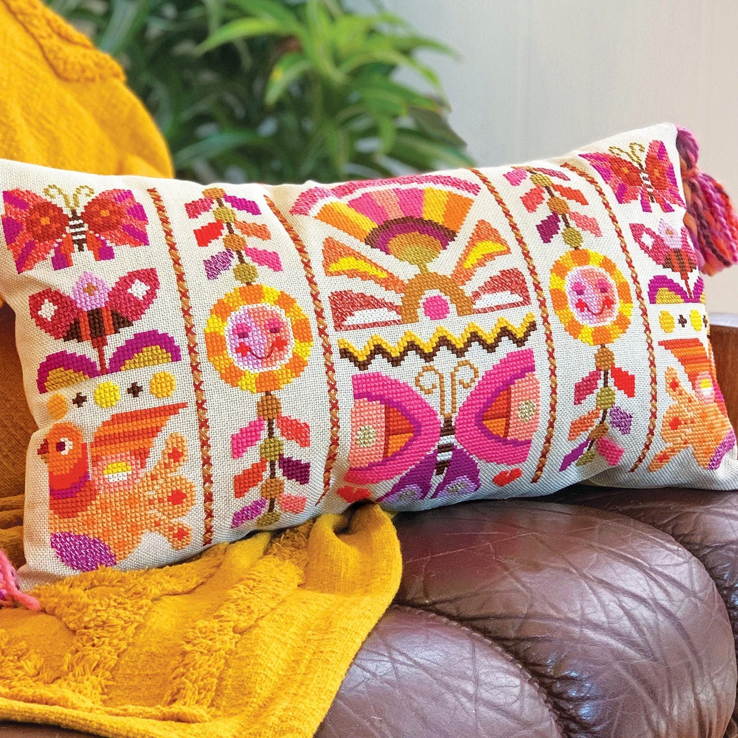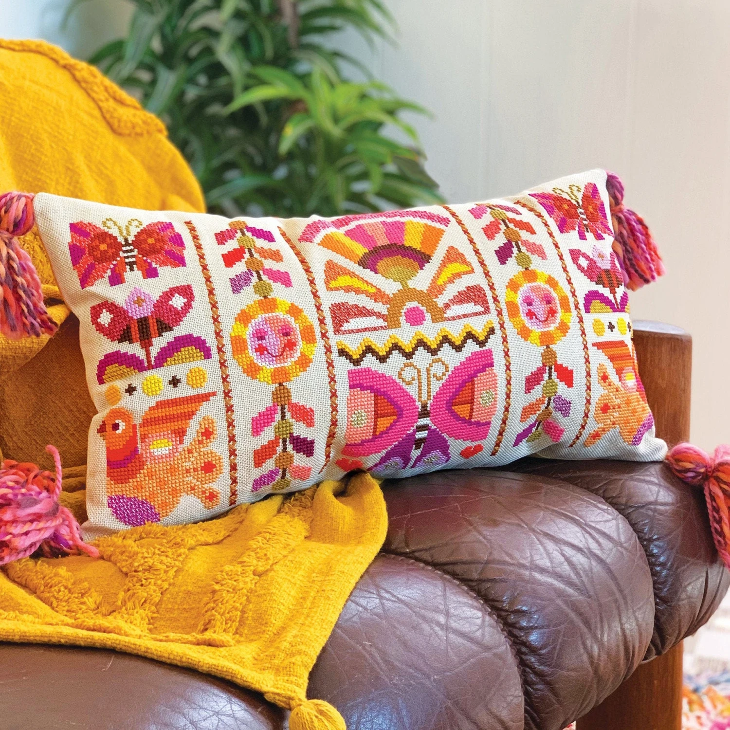 Heat Wave is a bright and cheerful cross stitch pattern by fan favorite Satsuma Street. Stitched in a vibrant mix of colors on large count fabric, this cross stitch project makes a big impression. Made into a pillow or framed on the wall, you’ll smile every time you see it.