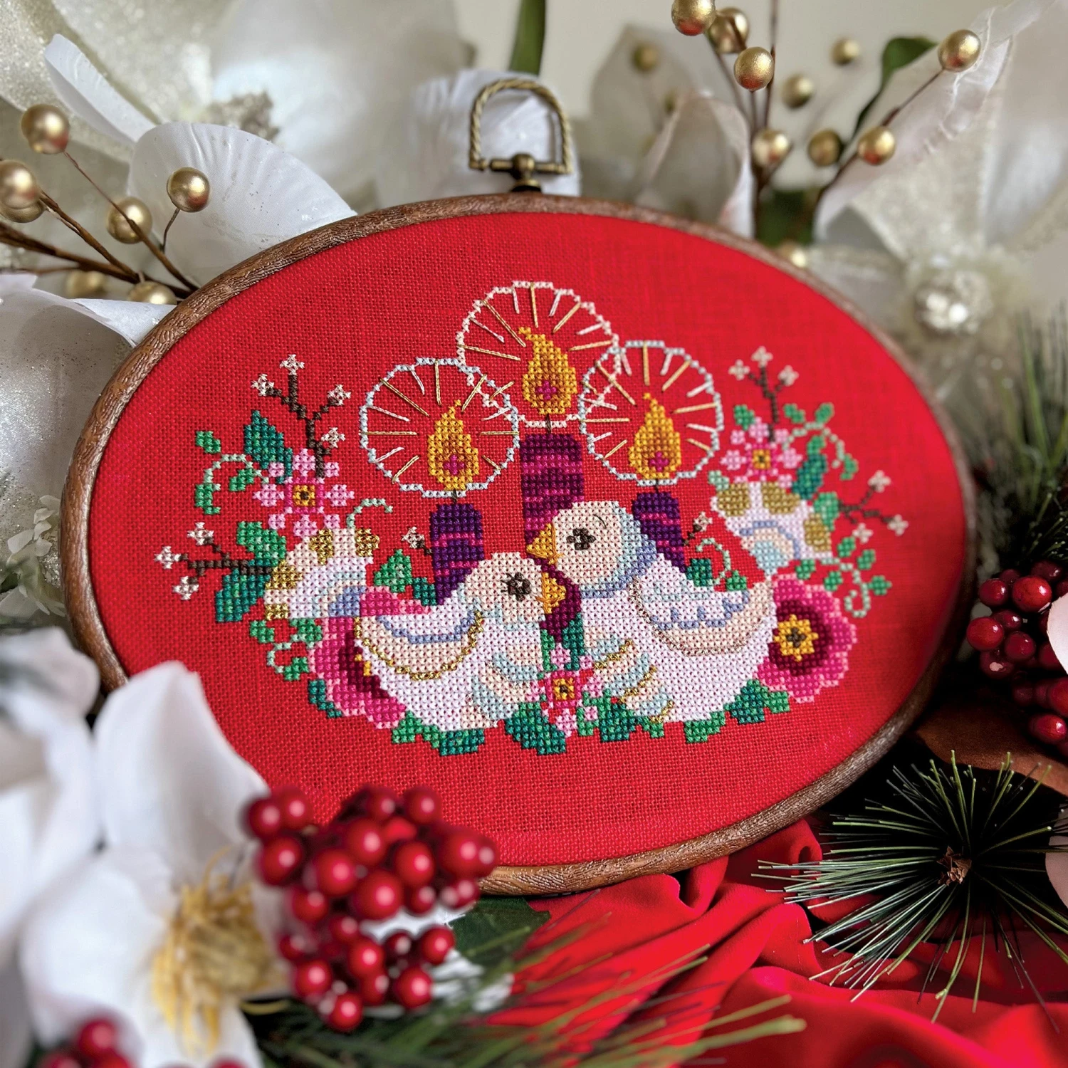 Bask in the warm glow of the holidays with this elegant counted cross stitch design by Satsuma Street. It would also make a sweet Valentine’s Day or wedding project!Â