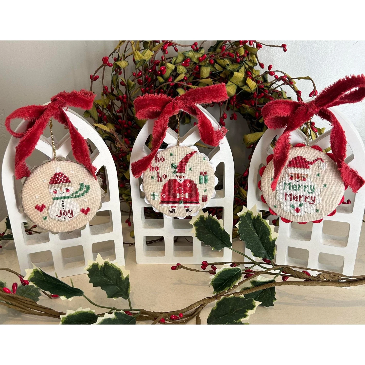 Stitched up three cute holiday ornaments with this counted cross stitch pattern by Emily Call Stitching. Charts for all three designs are included.