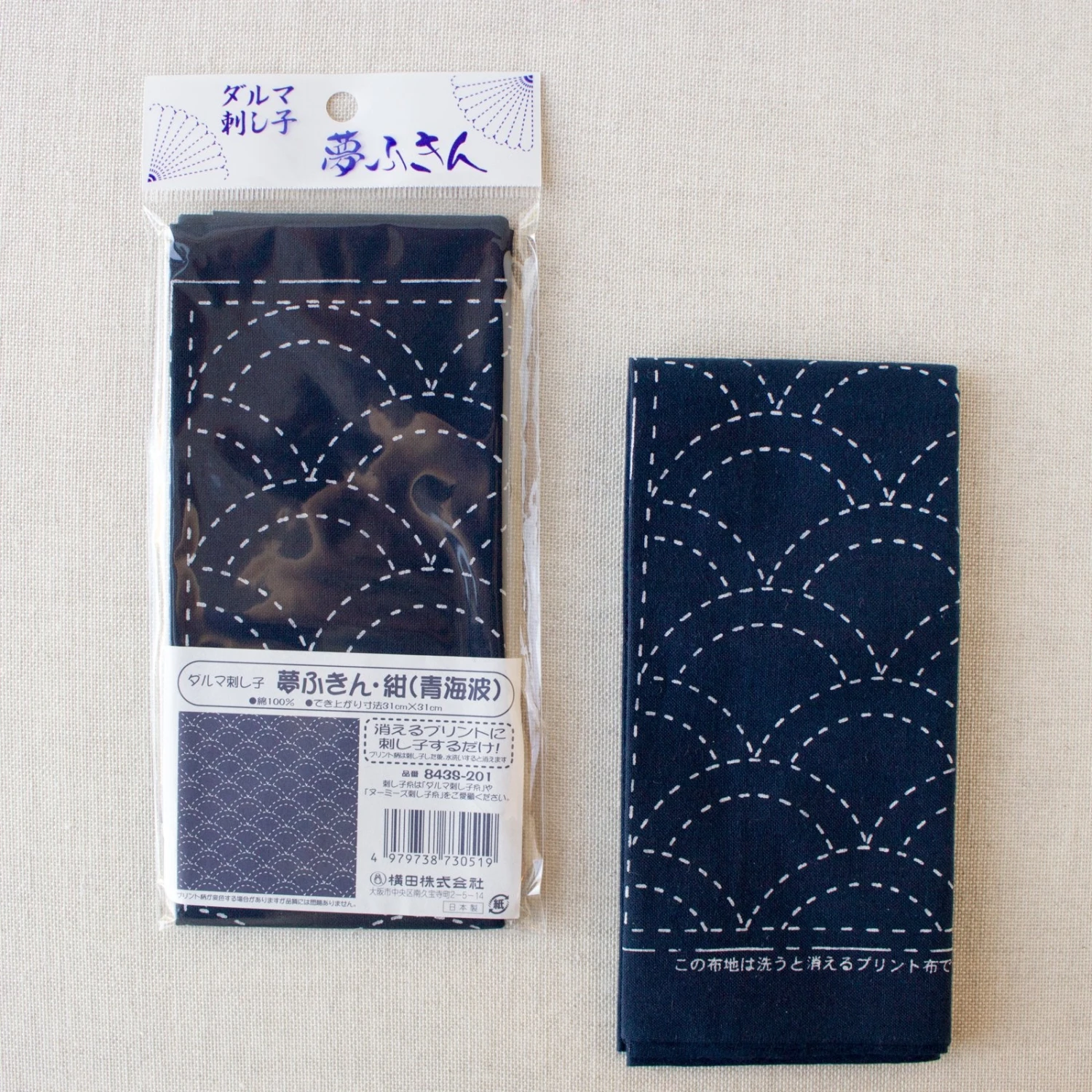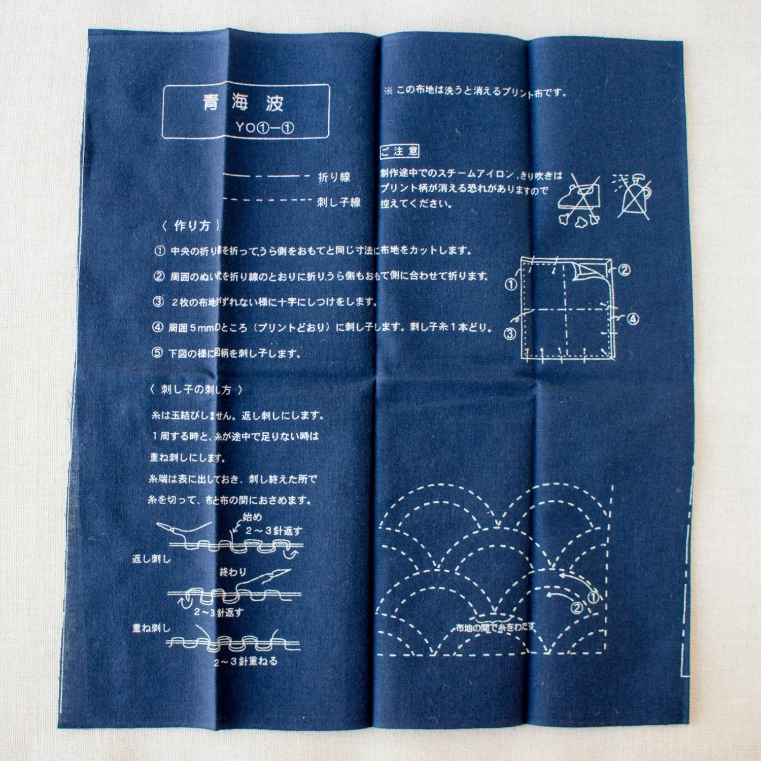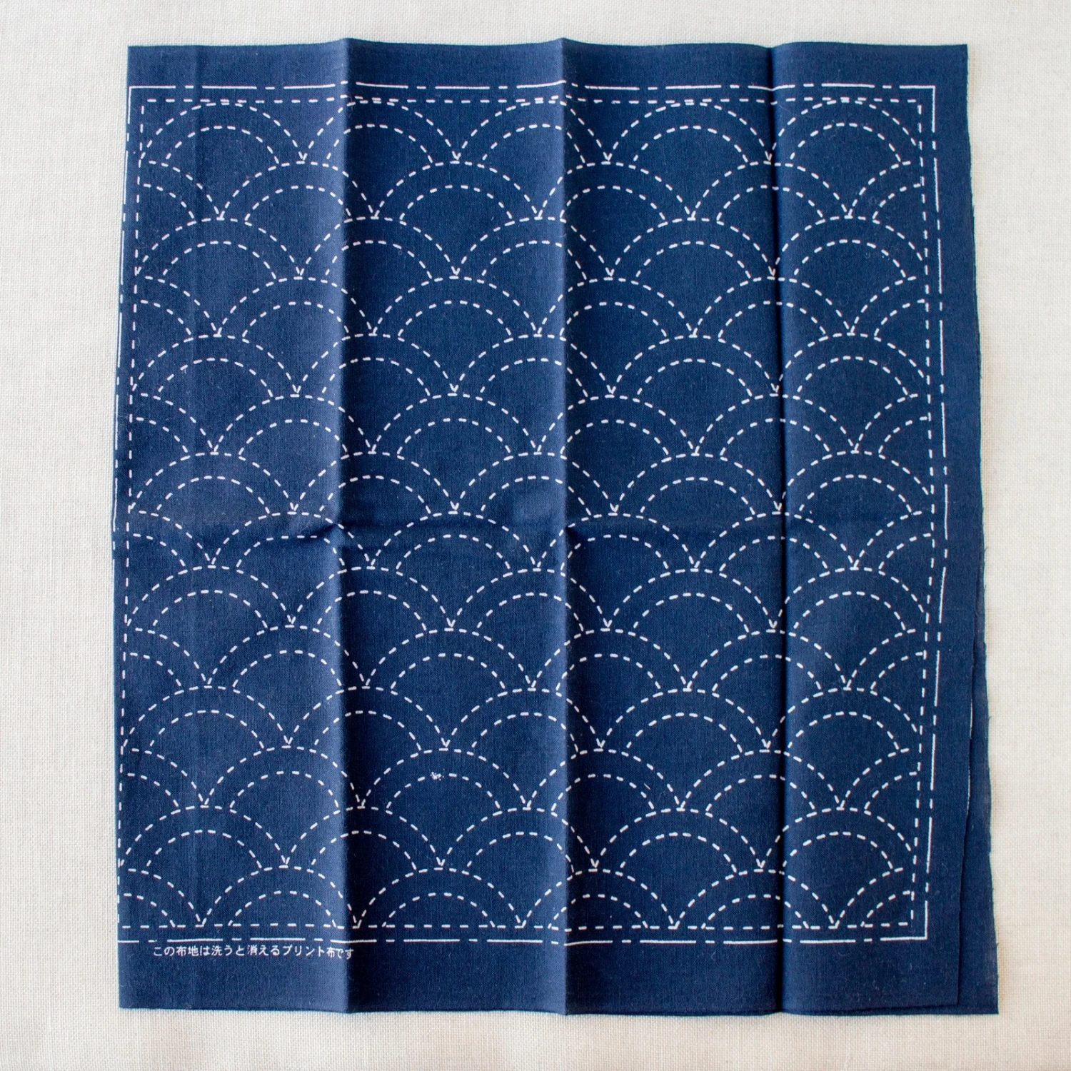 Sashiko is a traditional form of Japanese embroidery that uses a basic running stitch to create repeating patterns. This 100% cotton navy blue panel has the design pre-printed on it, so it’s easy to know just where to stitch. The printing washes out when you are done stitching.
