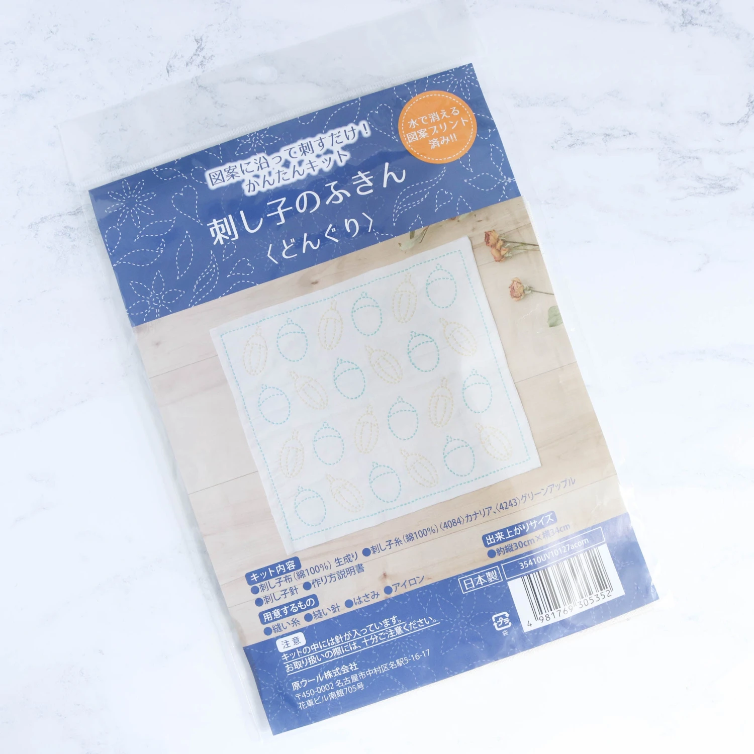 The kit contains the printed fabric, sashiko thread, and a needle. The instructions are in Japanese only, but those with previous sashiko experience or adventurous beginners can follow the illustrations to get started.