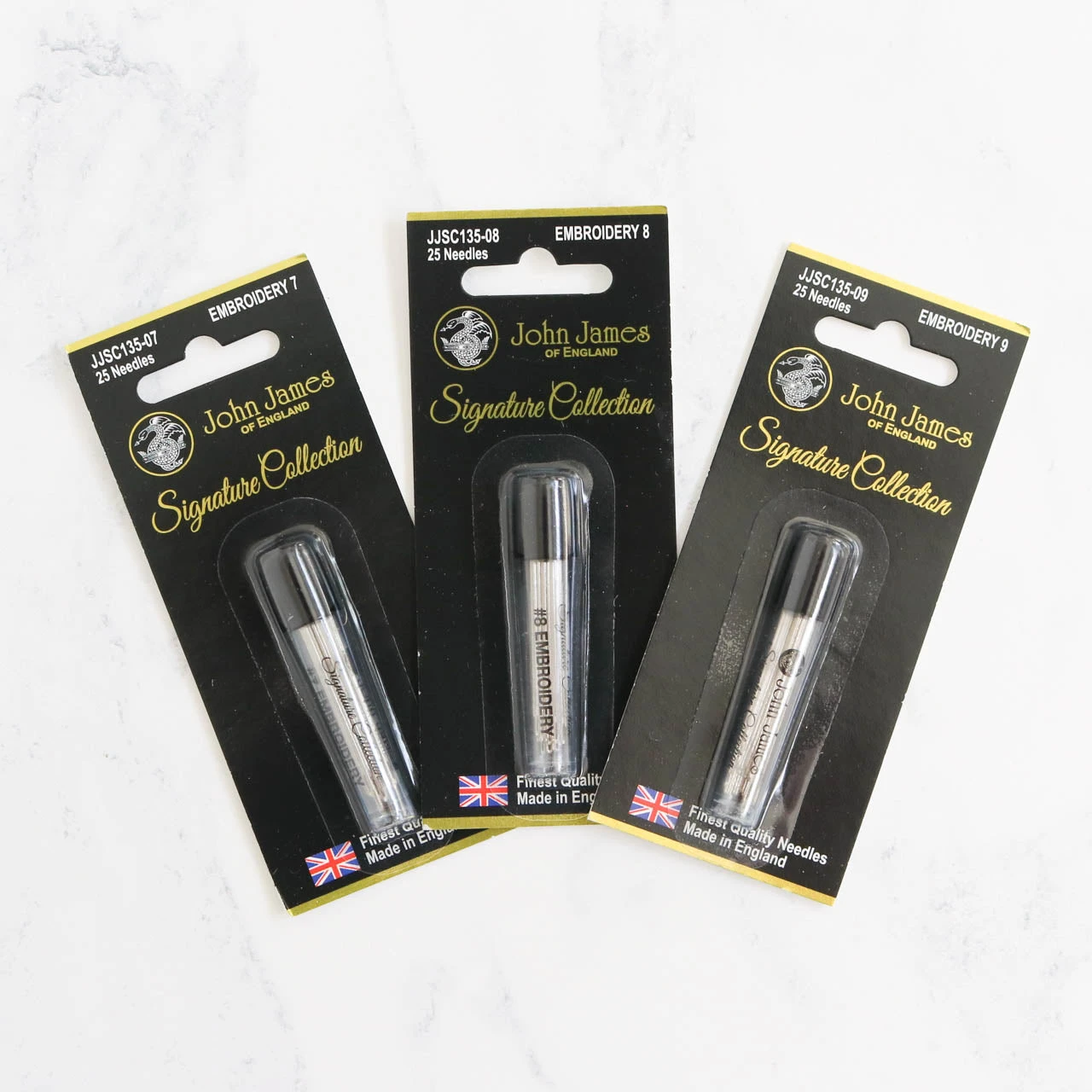 Never run out of needles with this collection of 25 high-quality embroidery needles. Packaged in a handy, crystal-clear tube, theses needles by John James are sharp and smooth with long eyes that are perfect for hand embroidery.Â