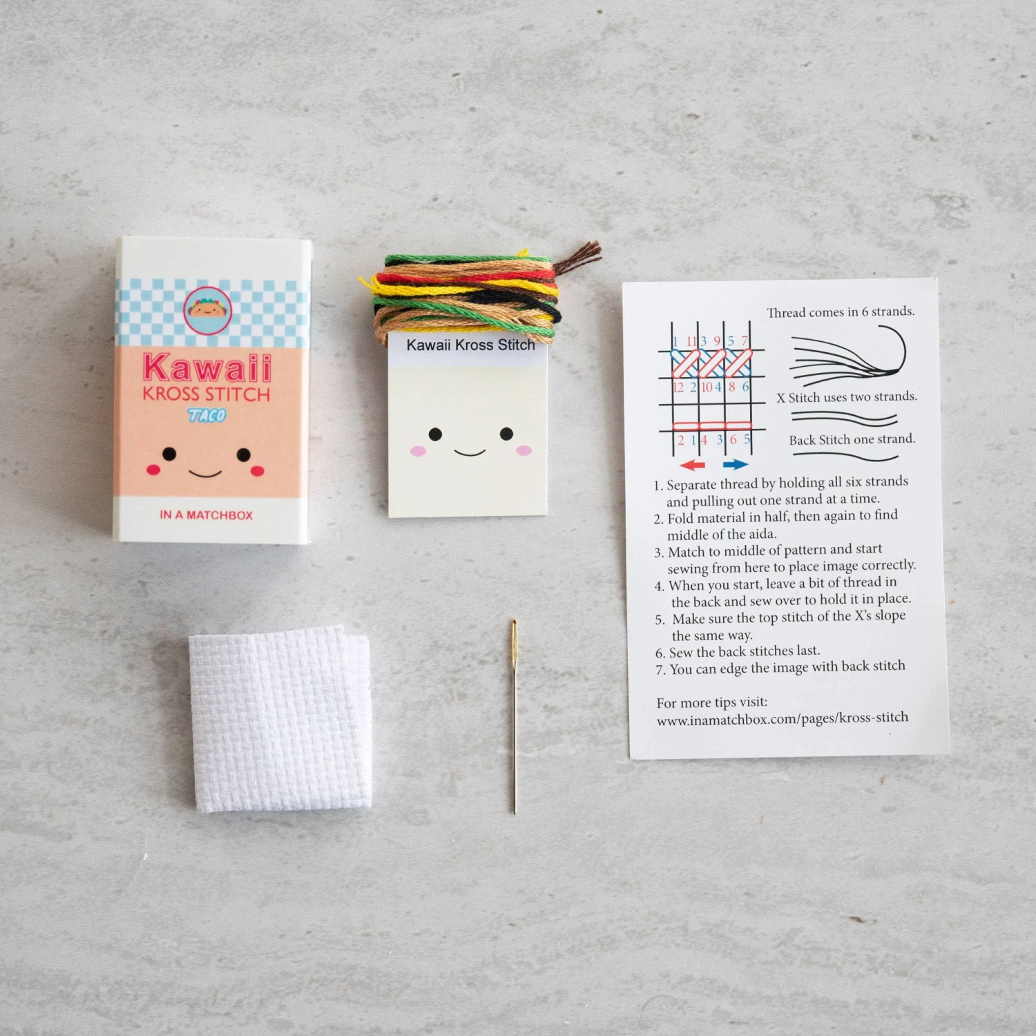 Everything you need to make the cross stitch pattern is packed neatly into a little matchbox. With easy to follow instructions, this gift is sure to delight any enthusiast or entice a newbie into the wonderful world of cross stitch.